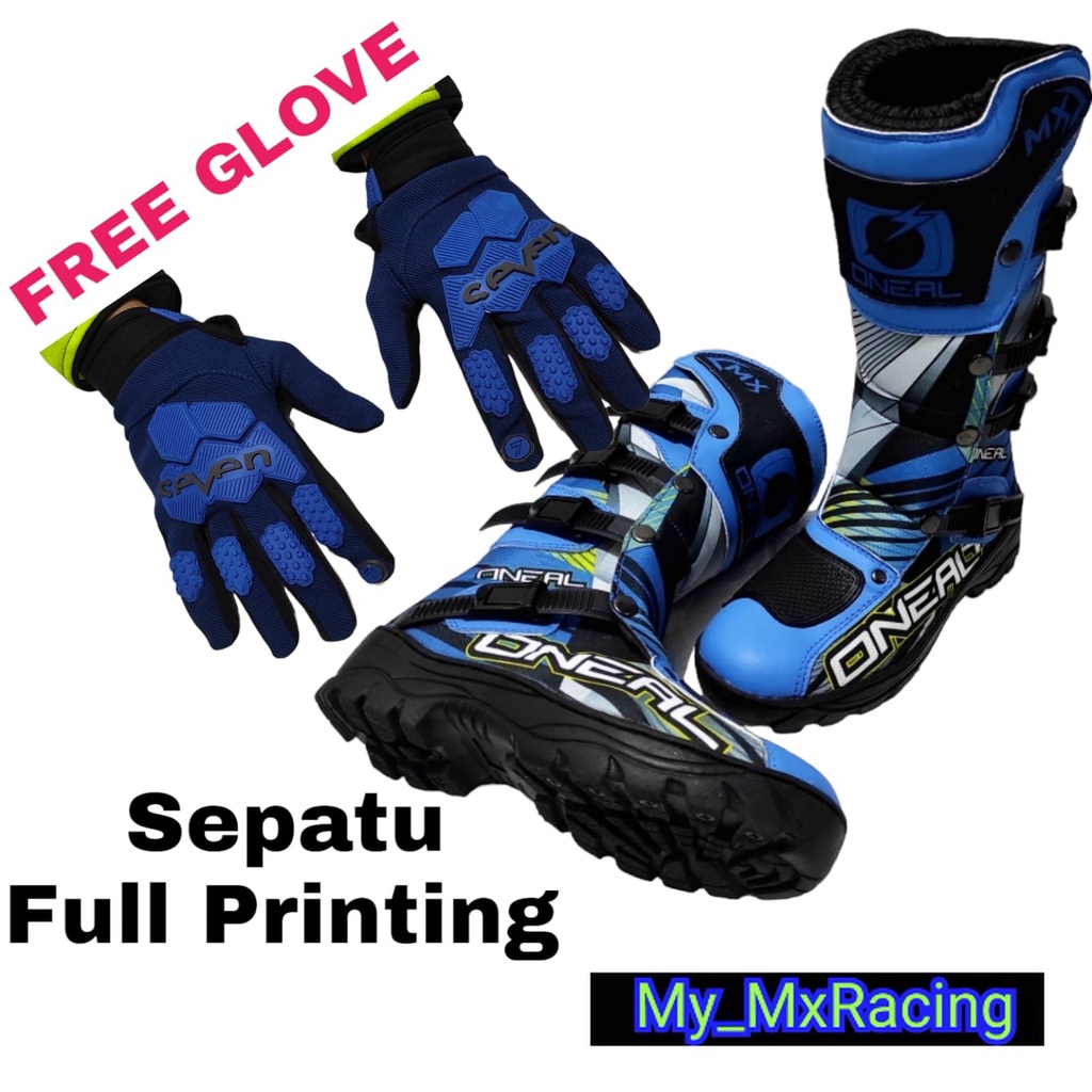 sepatu trail cross ful printing FREE GLOVE dengan desain menarik sepatu BLUE BLACK adventure trabas bots safety kombinasi piyu dan condura print