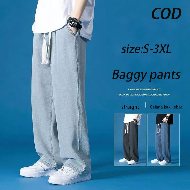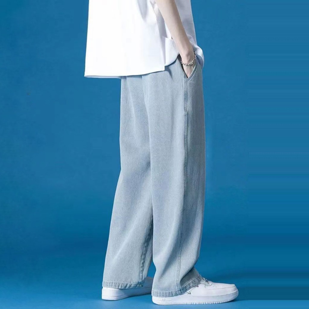 KeyBoy celana jeans pria baggy panjang straight korean style casual loose pants biru pinggang karet celana denim fashion dewasa cowok