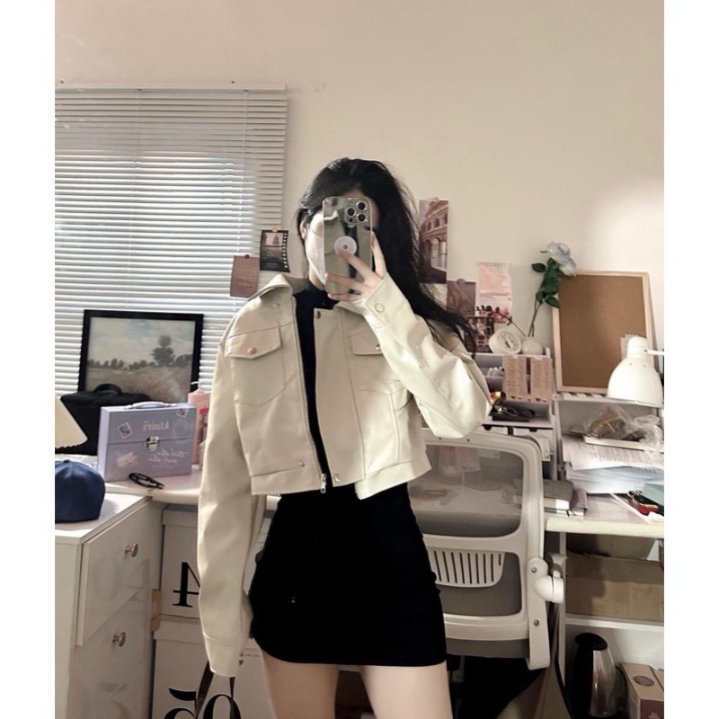 Dzakileather- Jaket Crop Wanita Saku Kancing Depan Tidak Berban Bawah