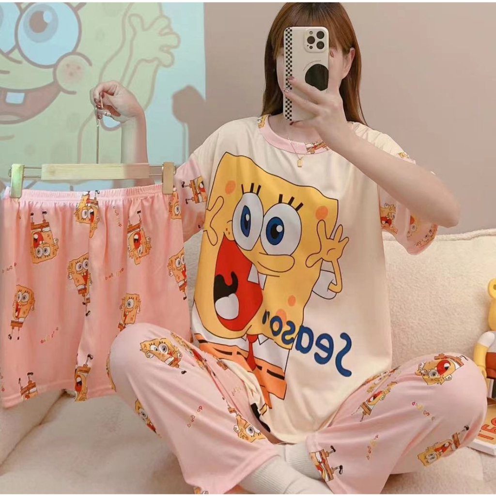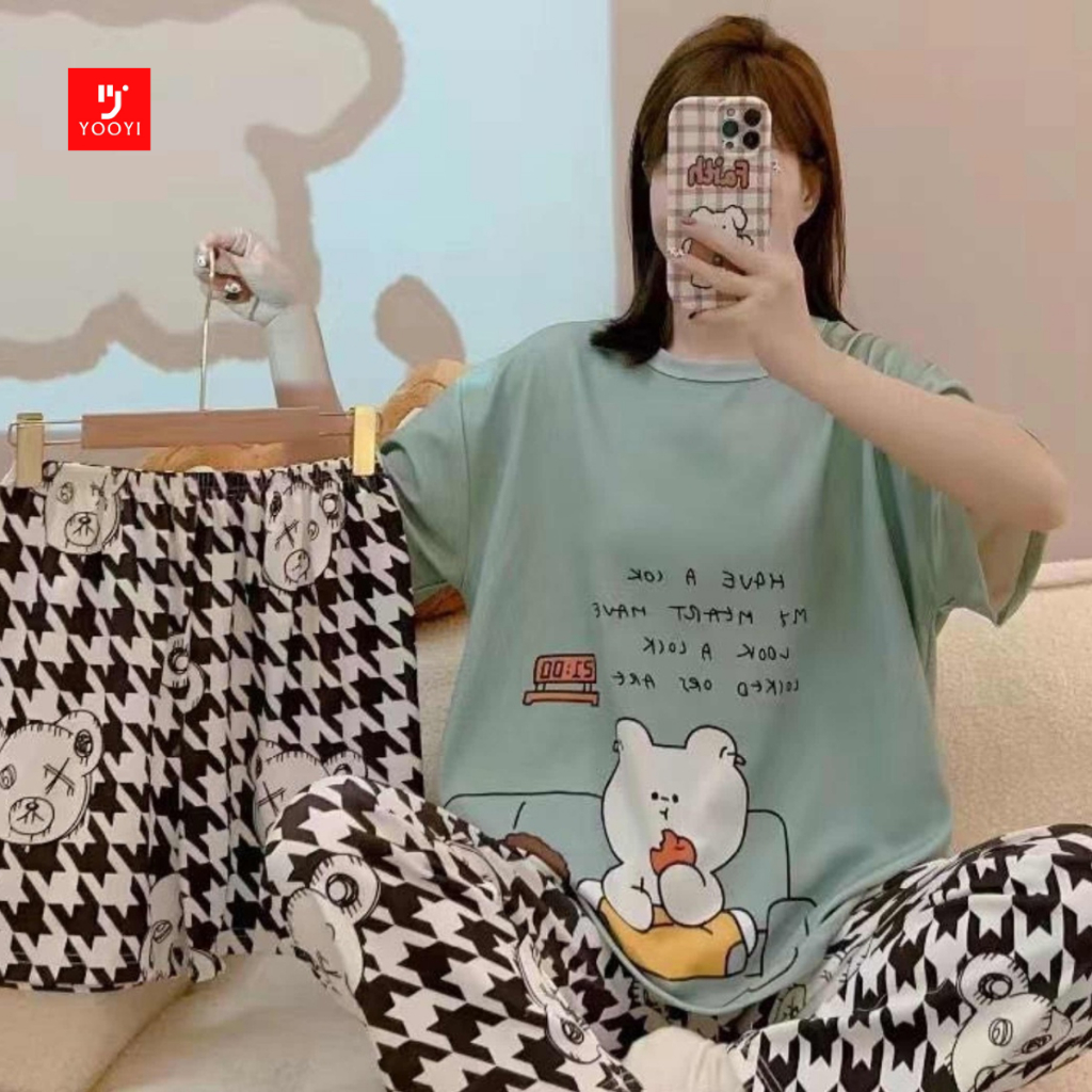 Yooyi Baju Tidur Wanita 3 In 1 Piyama Setelan Perempuan Dewasa Lengan Pendek Celana Panjang dan Celana Pendek Remaja 010