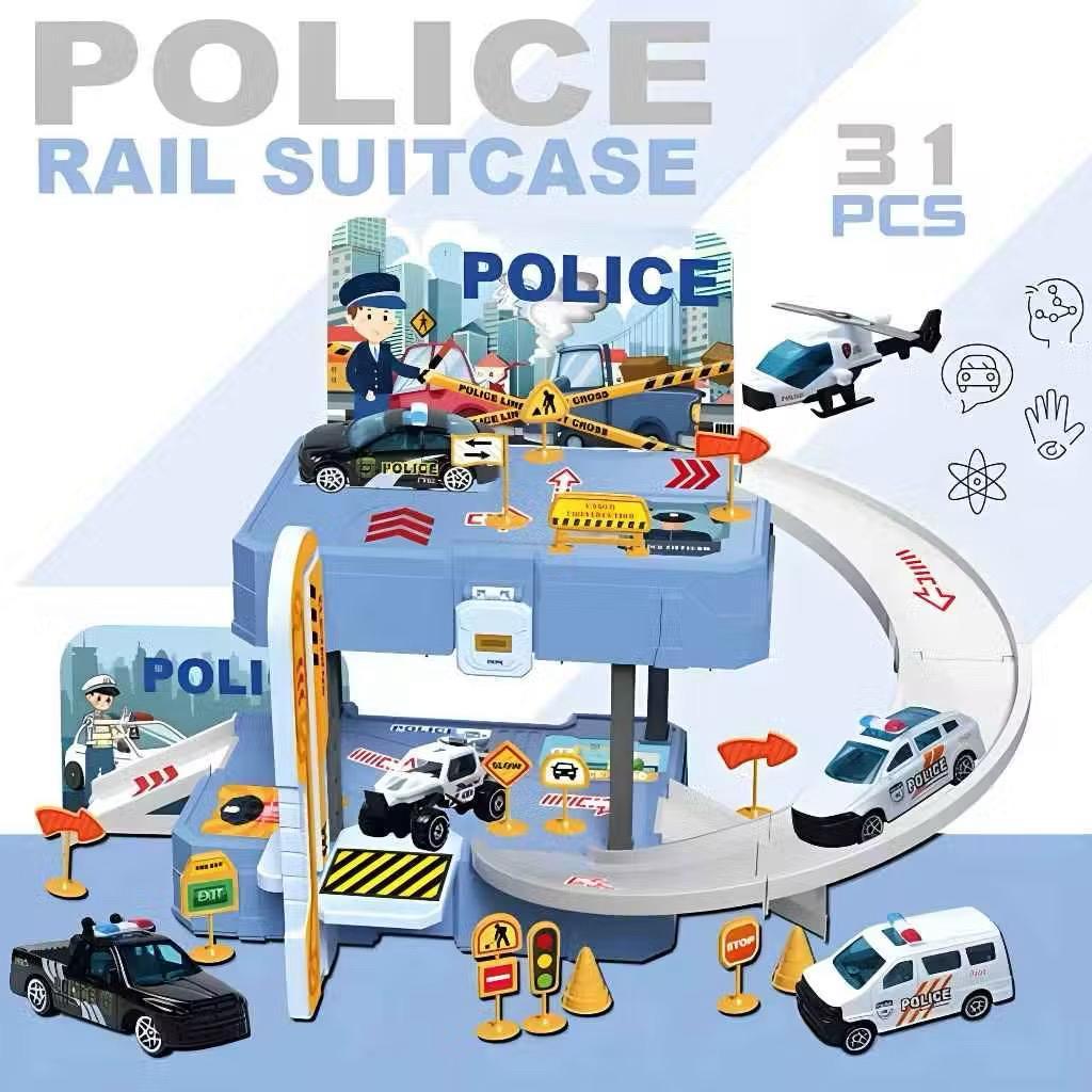 Mainan Anak Koper Track Police Rail Suitcase Car Parking Building Play Set - Mainan Parkir Mobil Mobilan