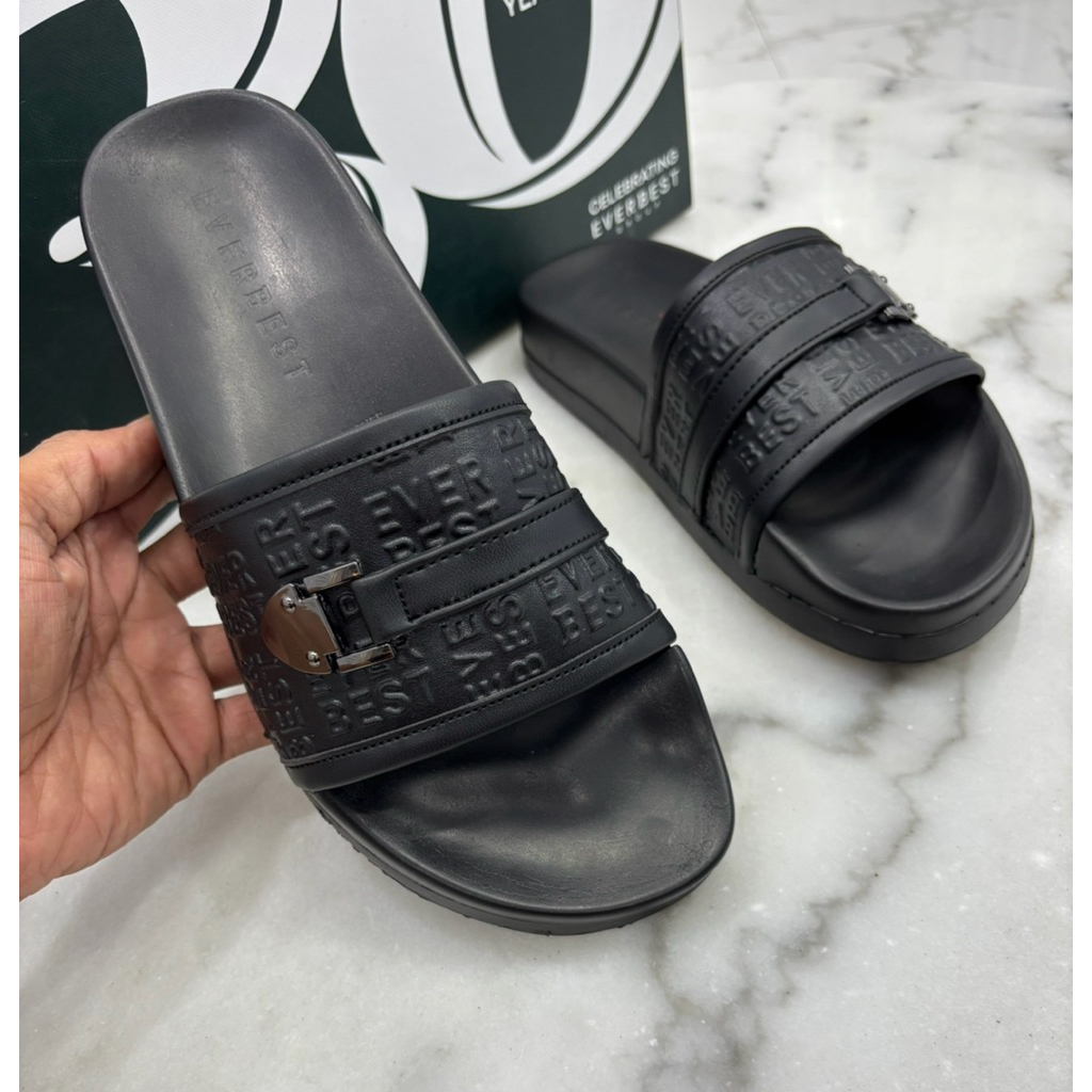 sandal slip on pria masa kini miror eb corak logo pita besi hitam+free box