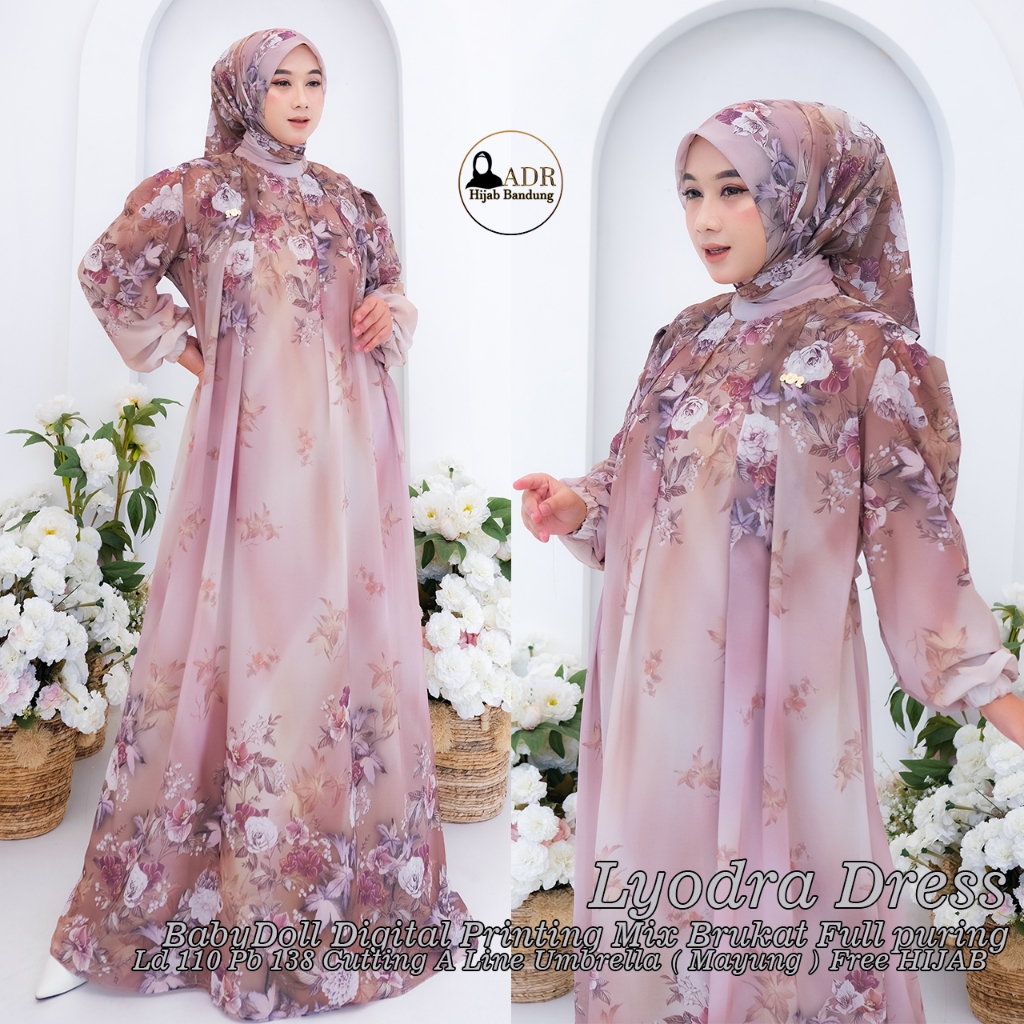 Dress Lyodra Gamis BabyDoll Digital Printing Full Furing dan Wudhu Free Hijab Muslim