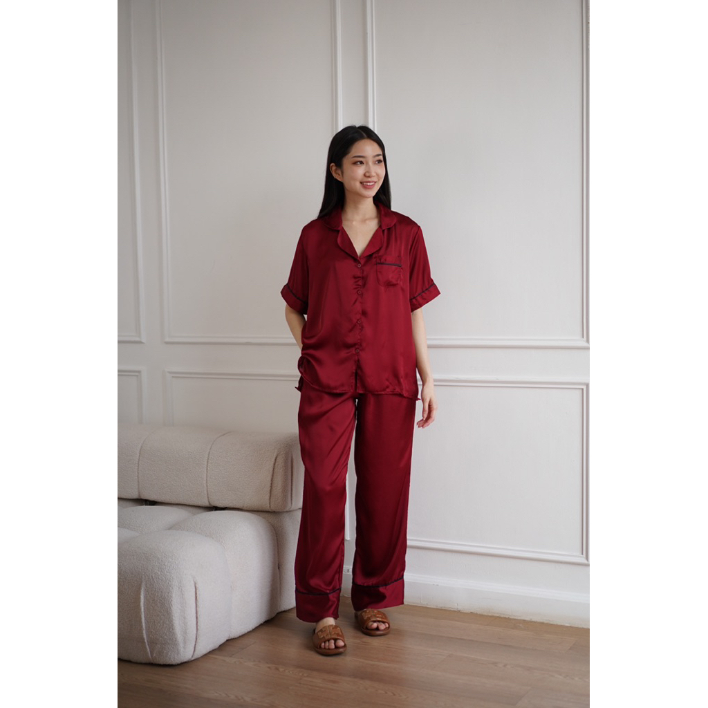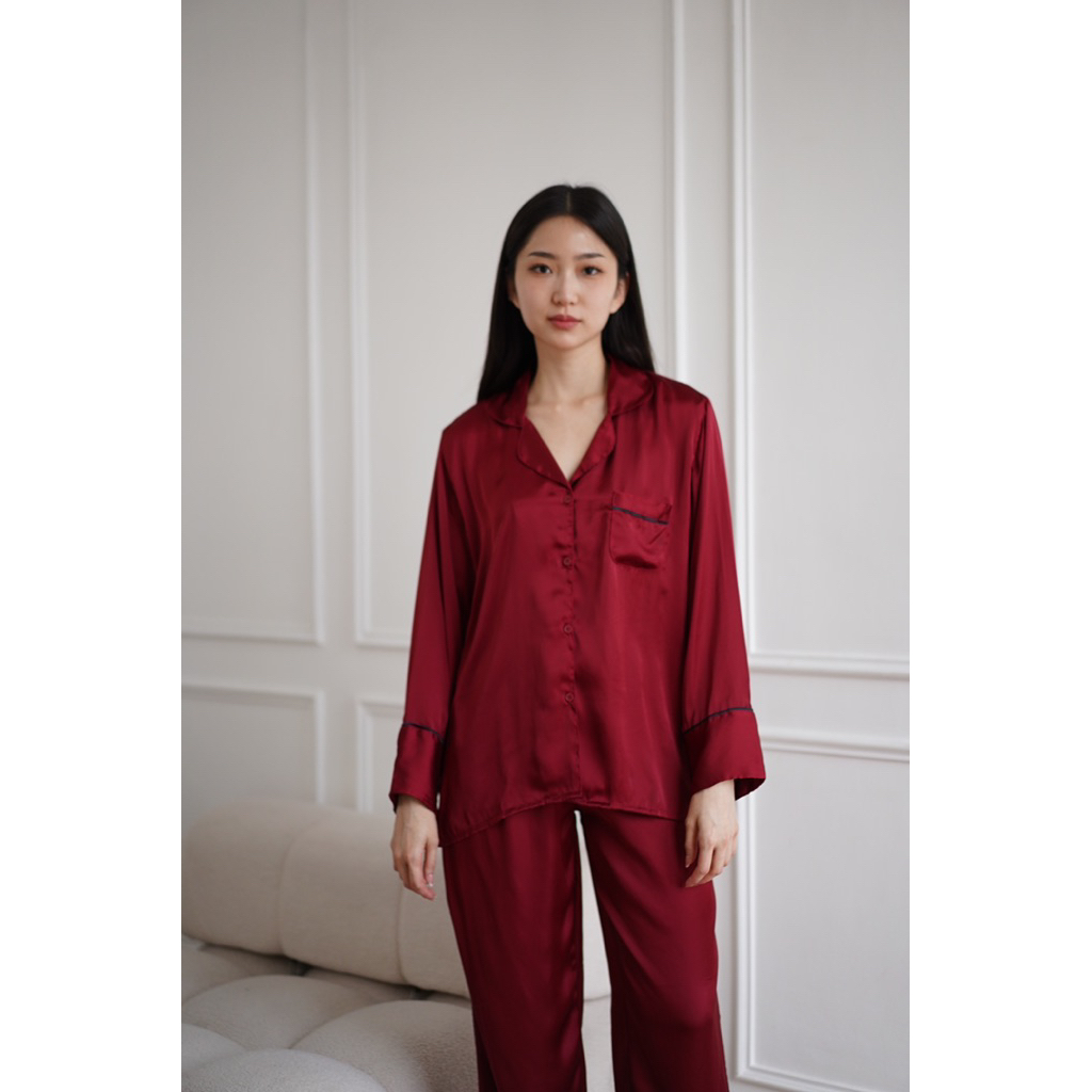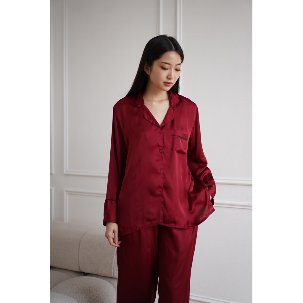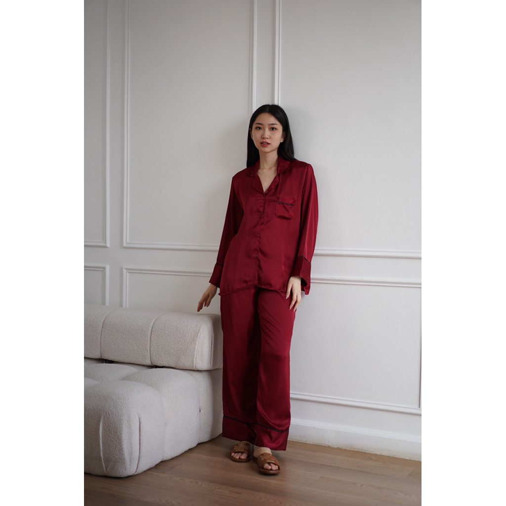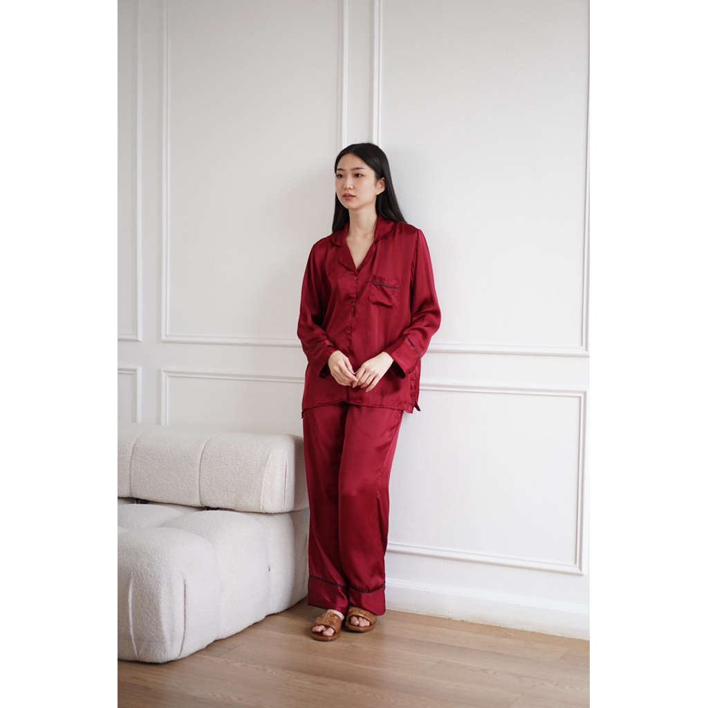 Piyama Polos Merah Renda Bahan Armany Silk Lengan Panjang