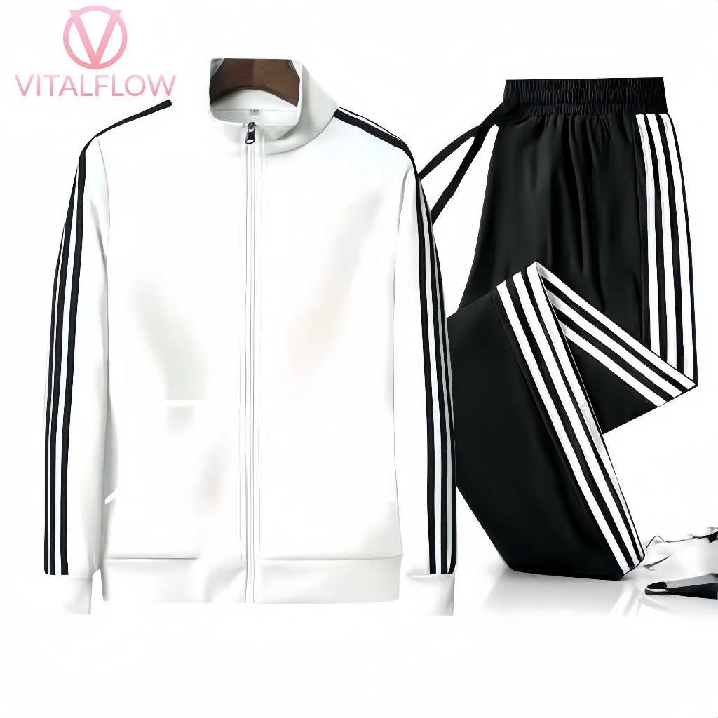 [VITALFLOW] Setelan Olahraga Pria dan Wanita, Celana dan Hoodie dengan Tiga Garis, Cocok untuk Outdoor, Lari, dan Santai