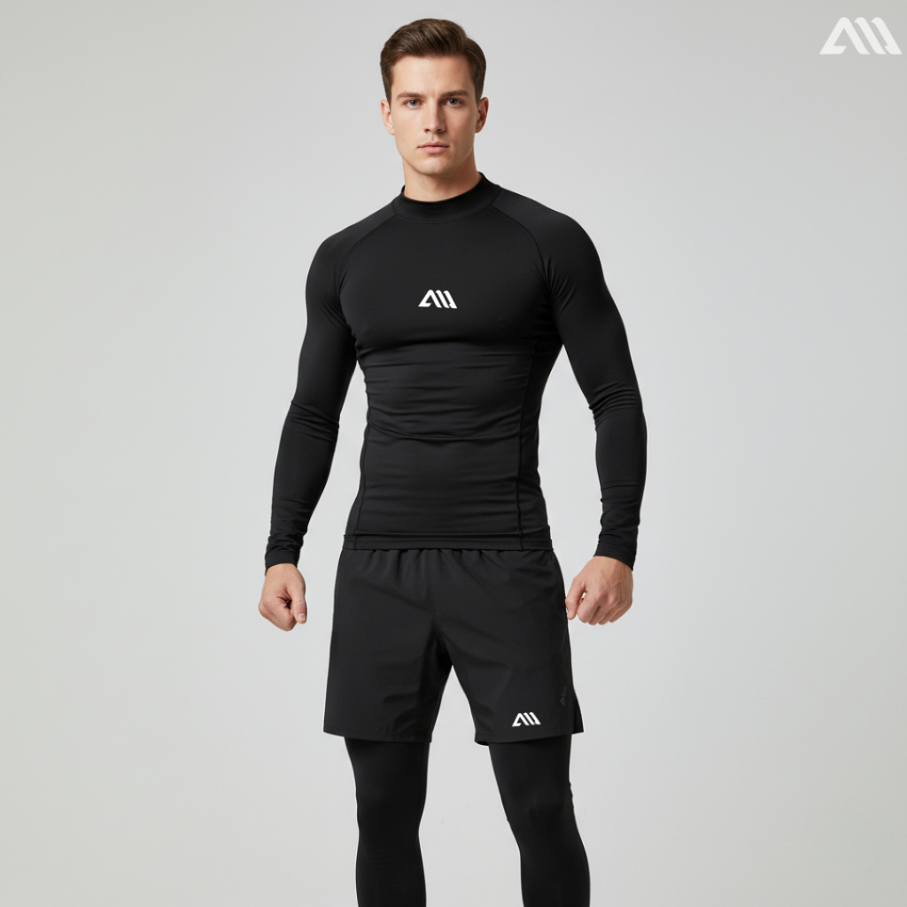 3 IN 1 - Stelan Olahraga Pria Baju Manset Baselayer Lengan Panjang Celana Legging Dan Celana Pendek