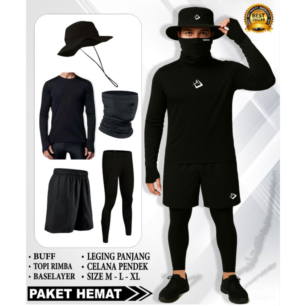 PAKET 5 IN 1 Manset Panjang Baselayer Gunung Buff Masker Wajah Legging Panjang Longpant Hikking Celana Pendek Topi Rimba