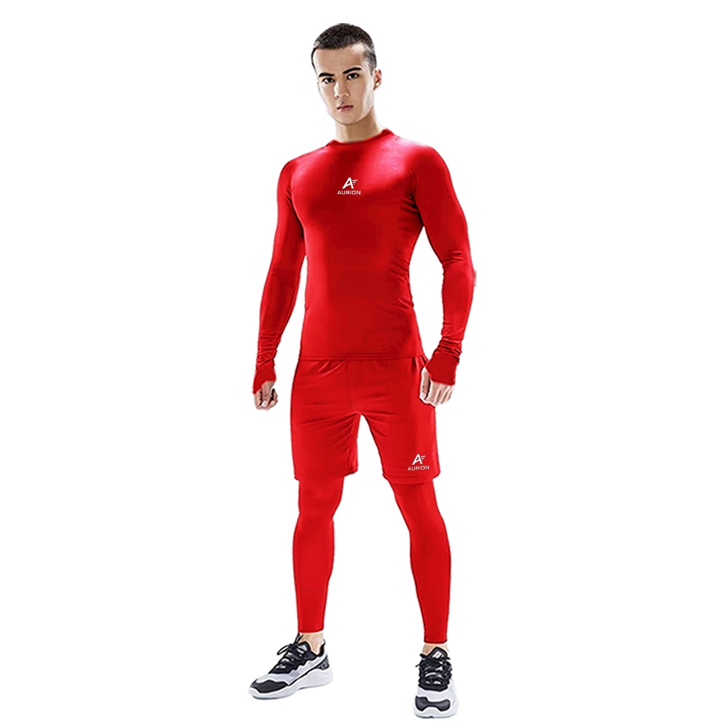 AURION Setelan Baselayer Lengan Panjang Celana Pendek Olahraga dan Manset Legging Pria Wanita