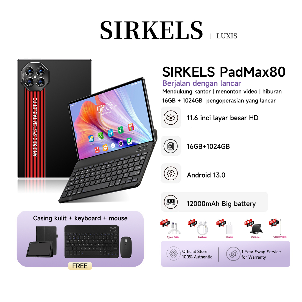 SIRKELS Tablet Max80 | RAM 16GB + 1024GB ROM | 12000mAh | Tablet + Mouse + Keyboard | 5G Dual SIM Wifi | Layar besar 11.6 inci [Sirkels Official Store]