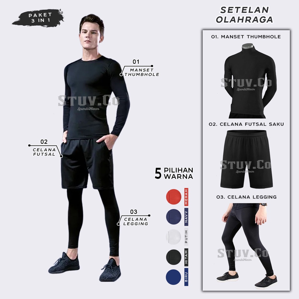PAKET 3IN1 STELAN MANSET BASELAYER THUMBHOLE LEGGING PANJANG DAN CELANA SAKU OLAHRAGA PRIA WANITA 5 WARNA