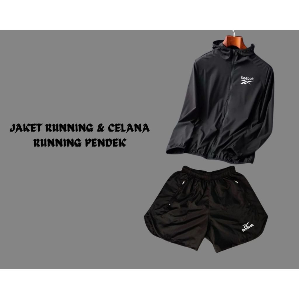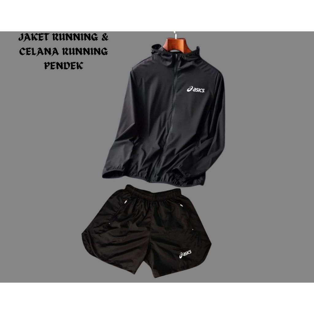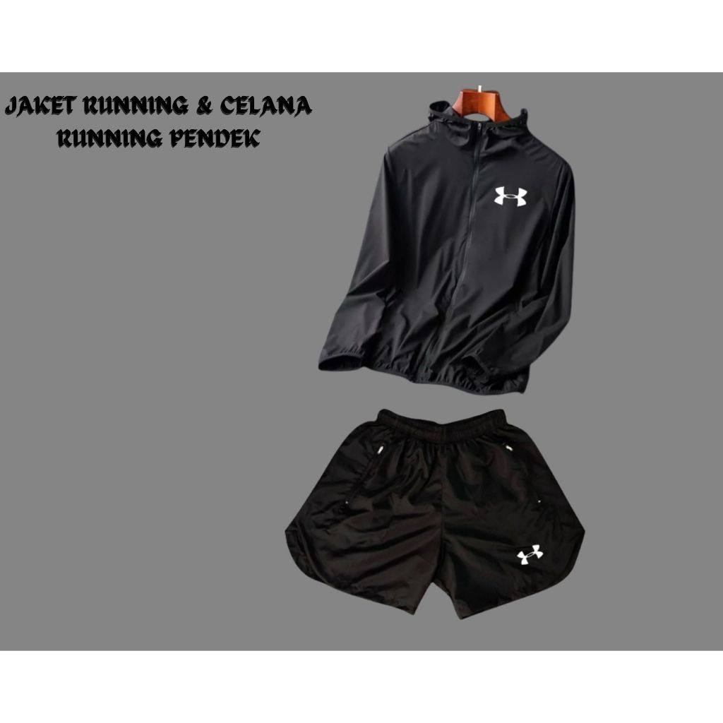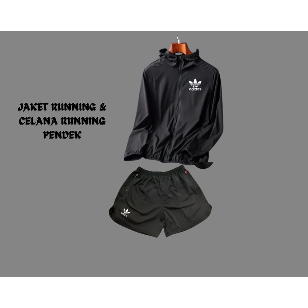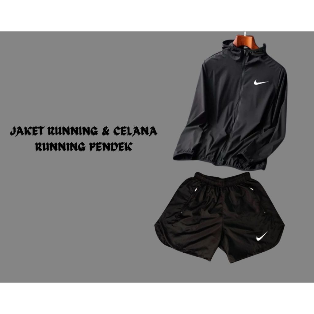 2in1 Stelan Olahraga Outdoor Latihan Lari Jaket Sauna Suit + Celana Pendek Parasut Saku Resleting Bahan Ringan Pria Wani