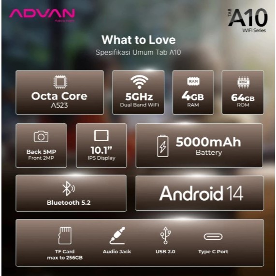 Advan TAB A10 Wifi 4GB/64GB 10.1”IPS Screen Tablet Android 14 5000mAh