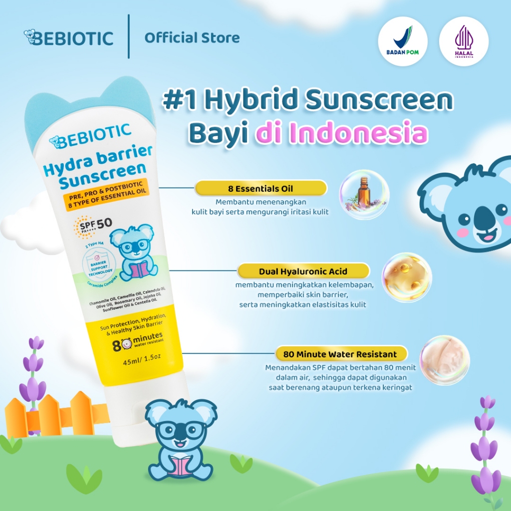Bebiotic Hydra Barrier Sunscreen Bayi SPF 50 PA++++ 45ml Non-Greasy water resistant 8 Essential Oil Melindungi Kulit dar
