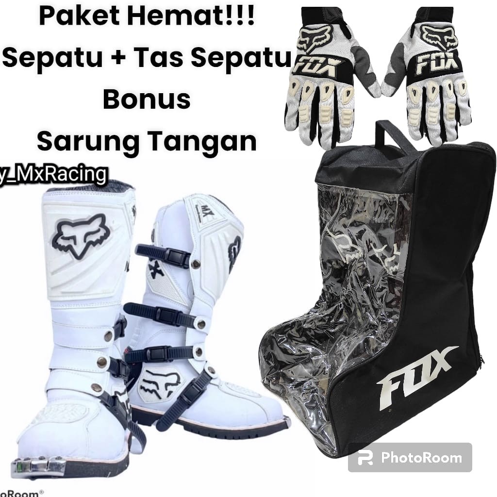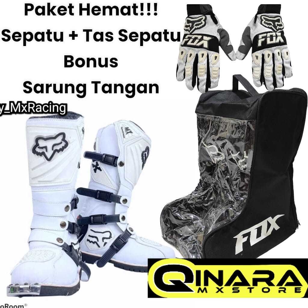 bisa paket hemat sepatu cross trail ujung besi plus tas jingjing buat sepatu bonus sarung tangan boots fx white