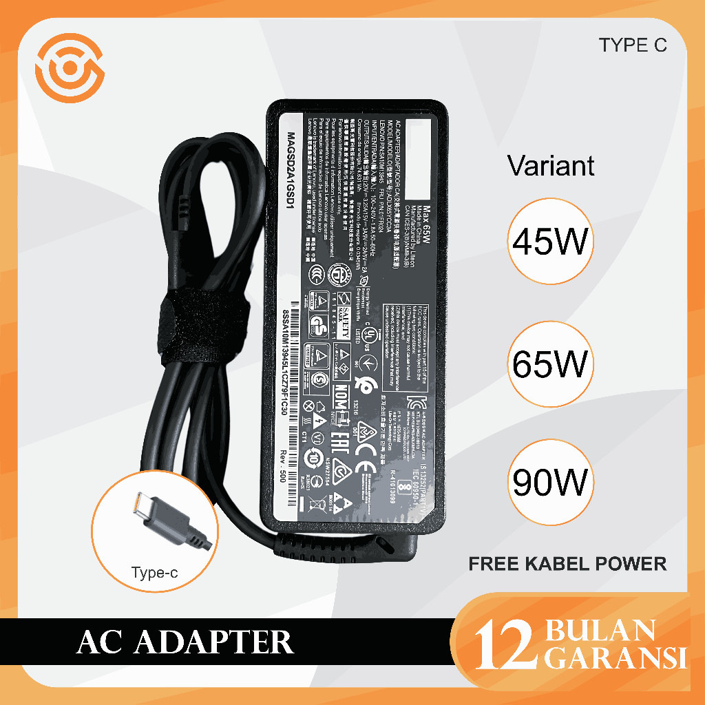 VOC Adaptor Charger Laptop ThinkPad IdeaPad Yoga Slim 2 Tipe Pin (Konektor USB Kuning / TYPE C) 20V 45W/65W/90W FREE Kabel Power