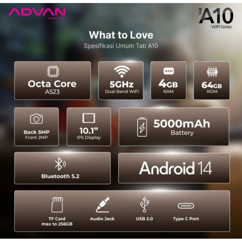 ADVAN TAB A10 Wifi 4GB / 64GB Layar 10.1”IPS Screen Tablet Android 14 | Tablet 4/64 - GARANSI RESMI