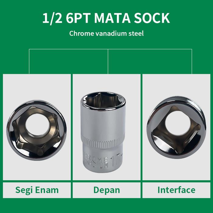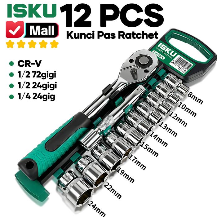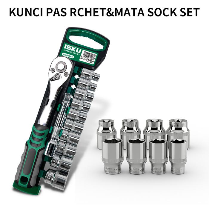 ISKU KUNCI SHOCK 12PCS DRIVE SOCKET 12 INCH SOCKET WRENCH SET 8-24MM DAN 10INCH EXTENSION BAR BAHAN CHROME VANADIUM KUNCI PAS RACHET 12 INCH - 1272GIGI-12PCS