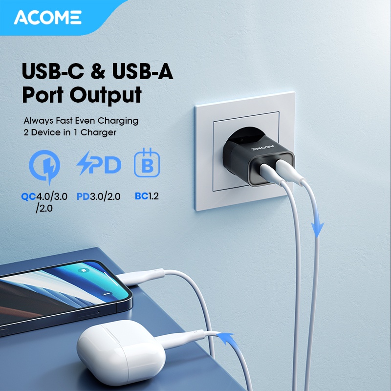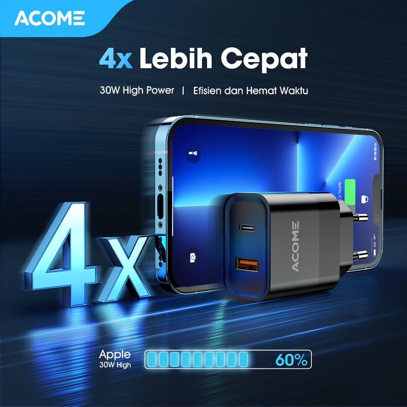 ACOME Charger GaN 30W Fast Charging PD/QC 3.0 Dual Port Support Laptop/iPad Garansi Resmi 1 Thn ACG30 PRO