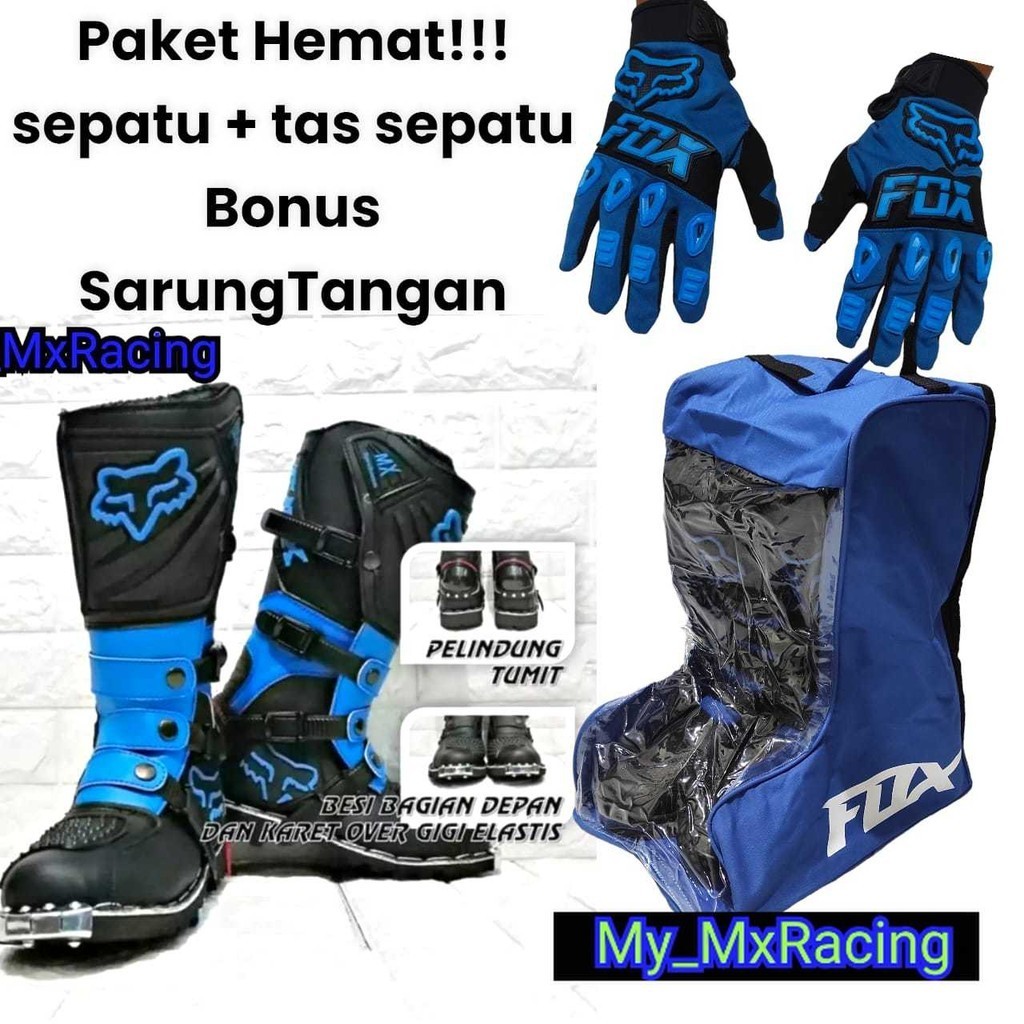 paket hemat sepatu cross trail ujung besi plus tas jingjing buat sepatu bonus sarung tangan boots fx BLUE