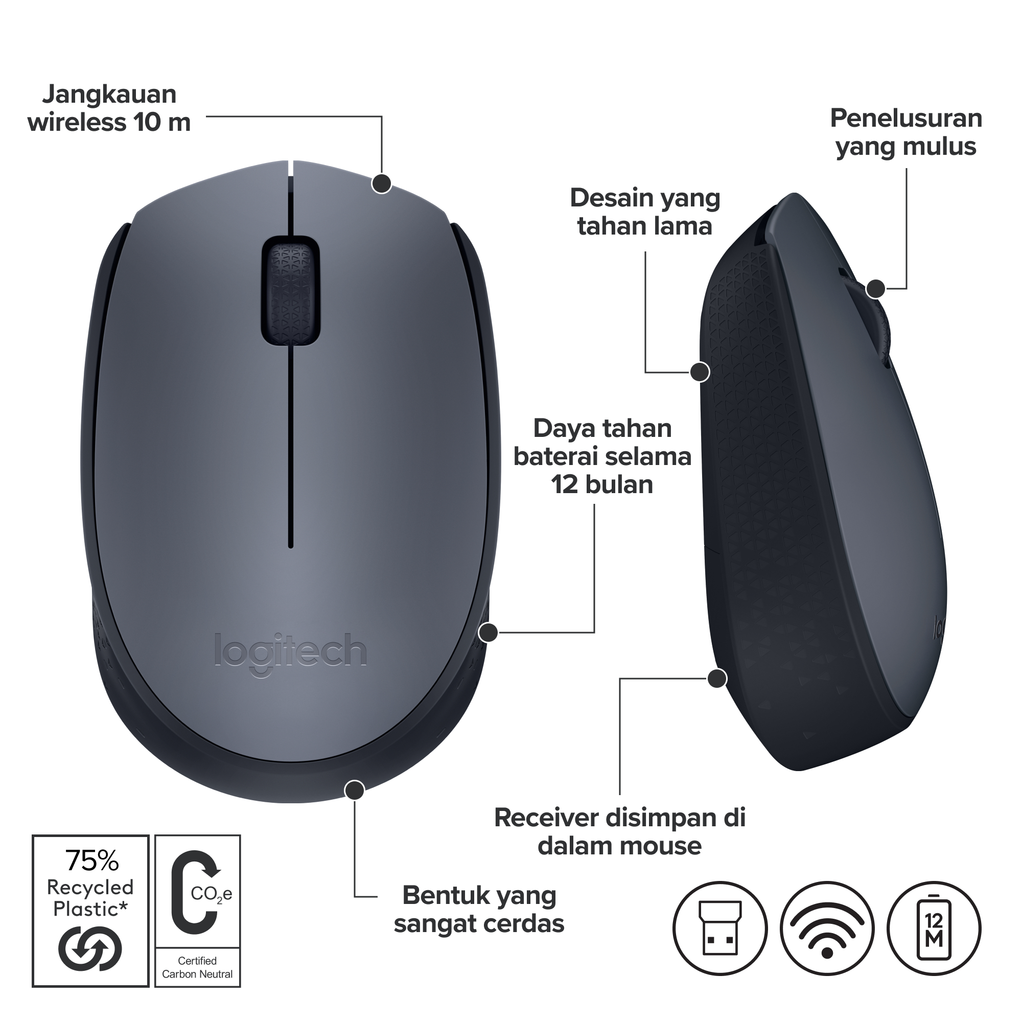 Logitech M171 Mouse Wireless untuk Windows, Mac, ChromeOS - Grey