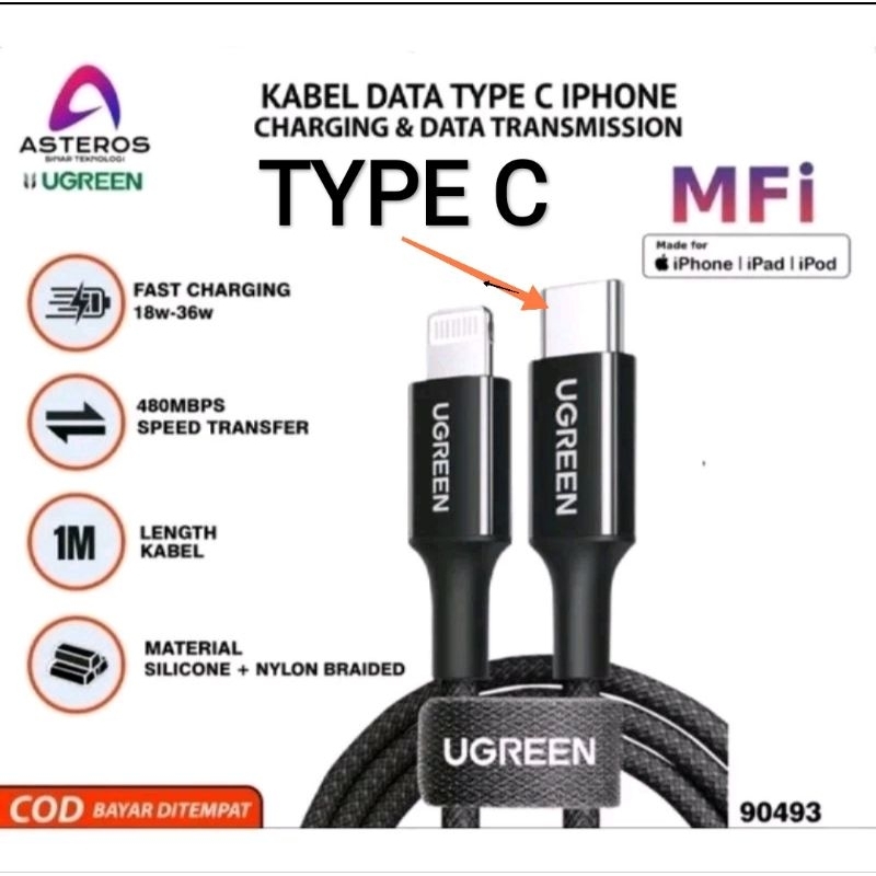 Ugreen USB C to Lightning MFi for iPhone 14 13 12 11 8 X XR XS Max - Ugreen Kabel Nylon / Silikon Lightning Original
