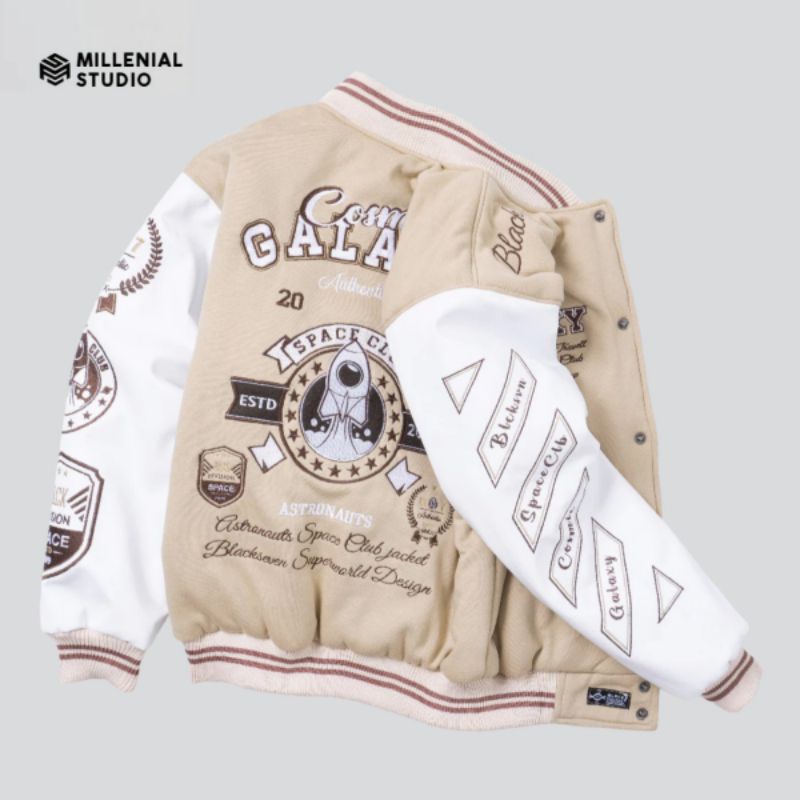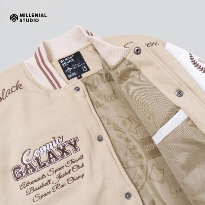 VARSITY JACKET COSMIC GALAXY CREAM WHITE | JAKET BASEBALL BORDIR ORI BLACKSEVEN | MILLENIAL STUDIO