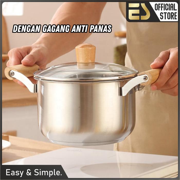 [ES x Mak San] Panci Sup Stainless Dengan Kukusan Gagang Kayu Tutup Kaca Anti Lengket Ukuran 20cm
