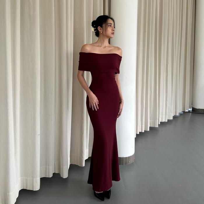 DIANE DRESS | ROOHA | Dress Panjang Wanita Off Shoulder Ribbed Knit Terusan Maxi Sabrina Dress Korean Long Dress - Beige