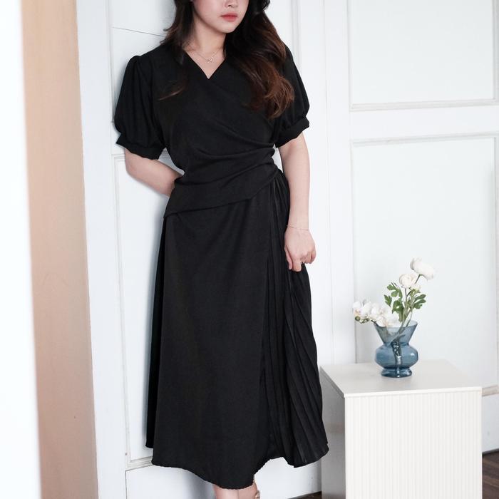 Selena Premium Pleats Dress / Korean Style Dress Plisket Tali Pinggang - Black, Regular