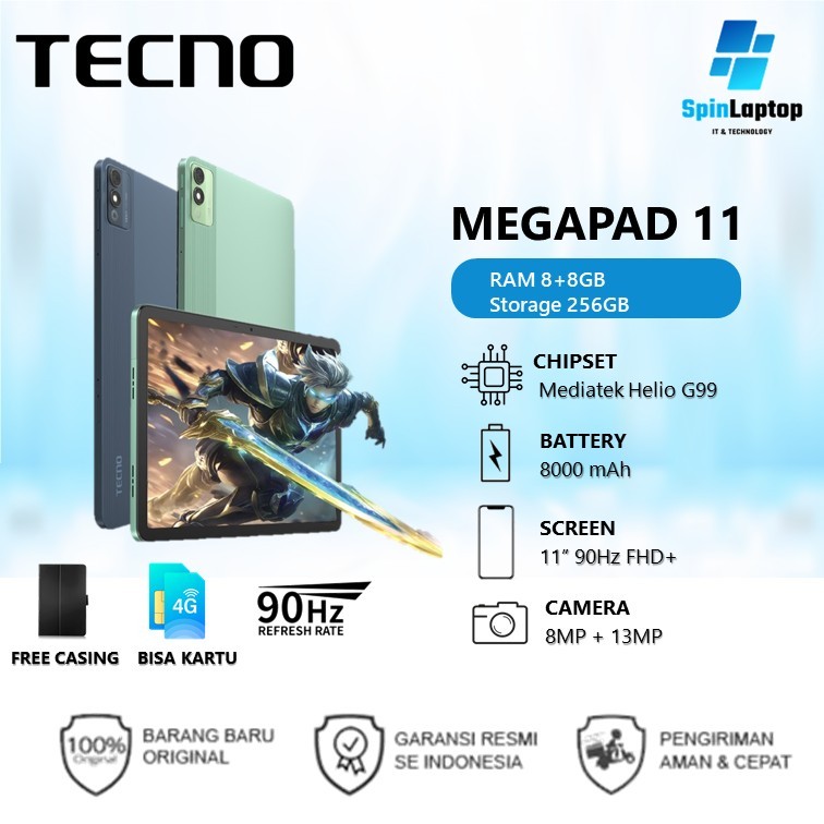 Tablet Tecno Megapad 11 4G LTE 8GB 256GB Mediatek Helio G99 Layar 11inch 90Hz Baru garansi Resmi