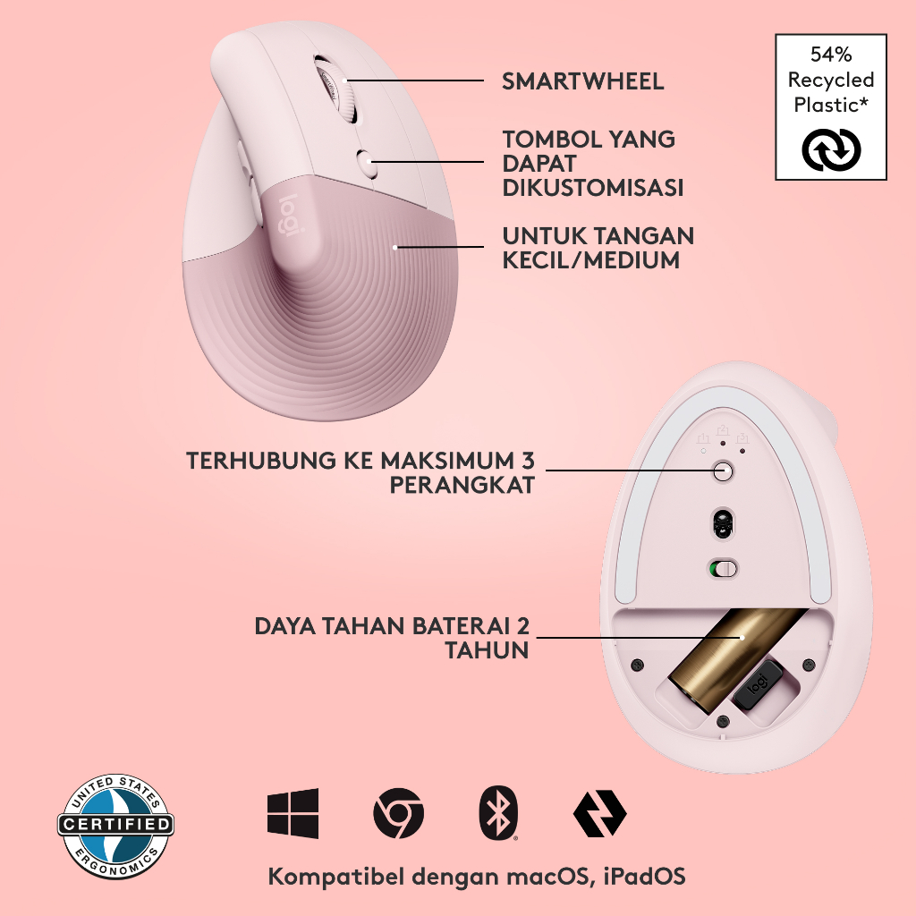 Logitech LIFT Mouse Ergonomic Vertical Wireless Bluetooth Silent - Rose