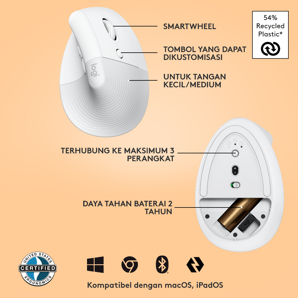 Logitech LIFT Mouse Ergonomic Vertical Wireless Bluetooth Silent - Off White