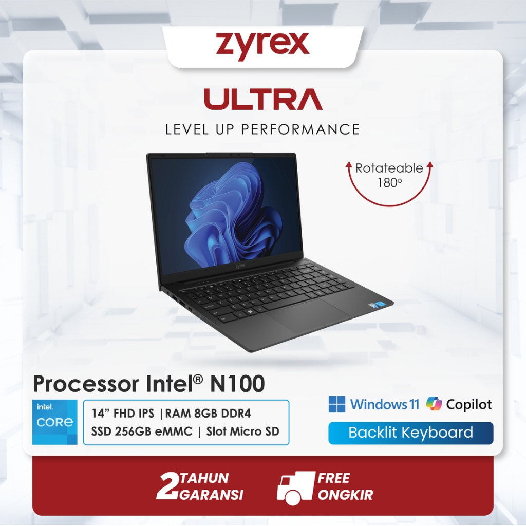 Zyrex Ultra N100 Laptop 14 Inch FHD – Intel N100, RAM 8GB, 128GB eMMC + 256GB SSD, Backlit Keyboard, Windows 11 – Garansi Resmi 2 Tahun