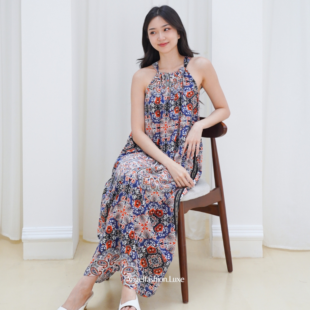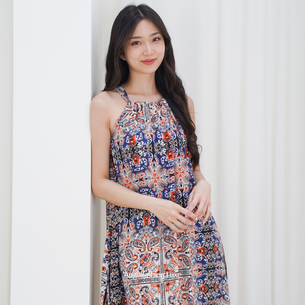 Dress Midi Rayon Wanita Korean Style Tanpa Lengan Premium Motif Kekinian