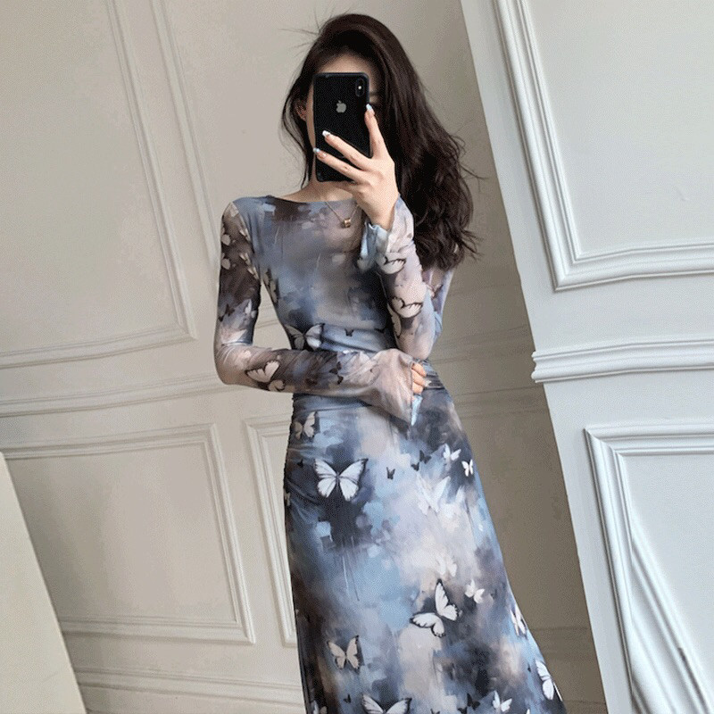 9194 Gaun Retro Pinggang Ramping bermotif kupu kupu gaun bunga - G047