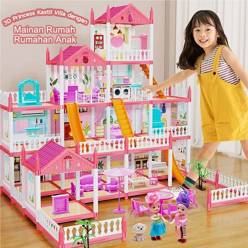Mainan Rumah Rumahan Anak Perempuan 3D Princess Kastil Villa dengan Lampu dan Boneka Perakitan DIY Rumah Mainan Gift