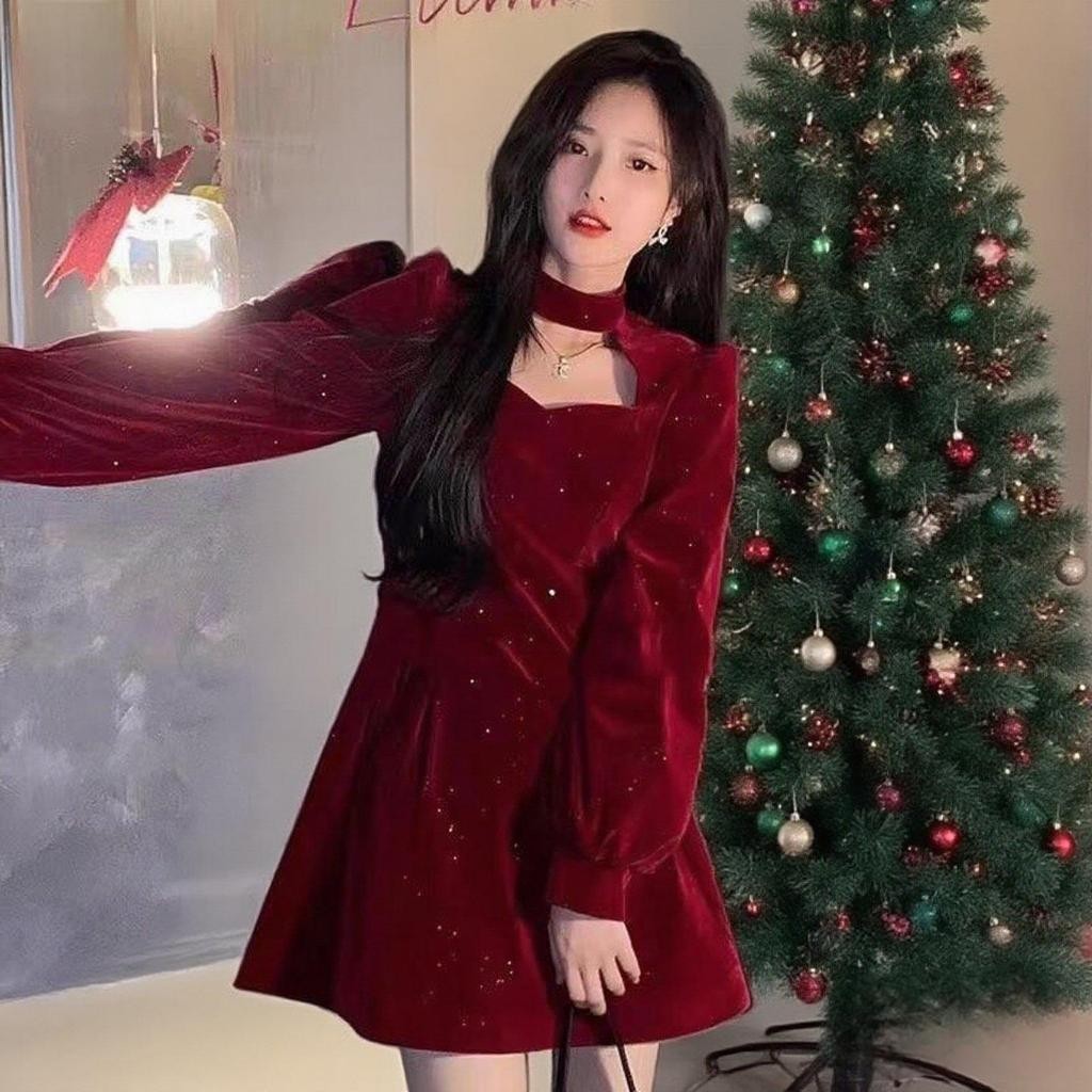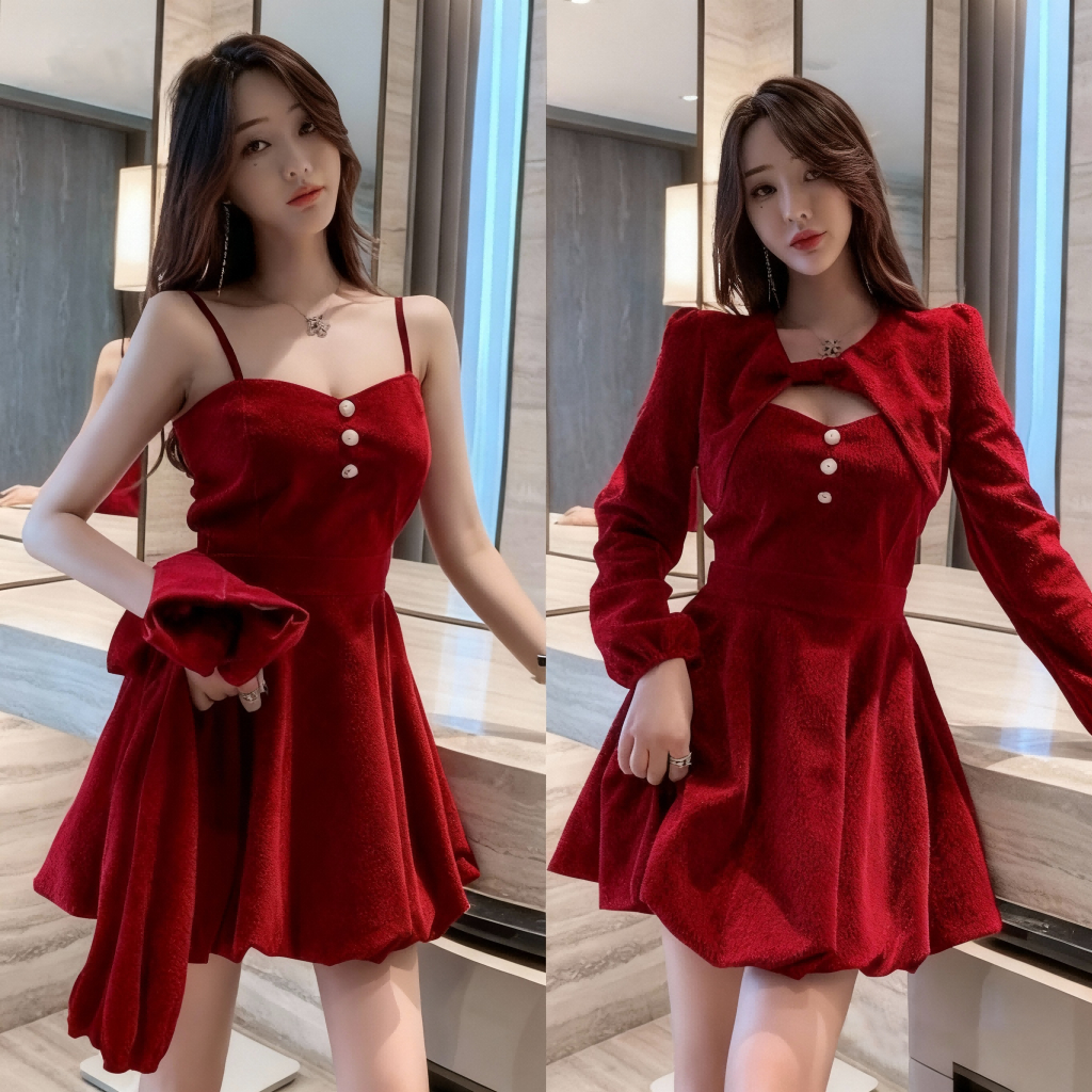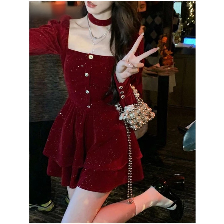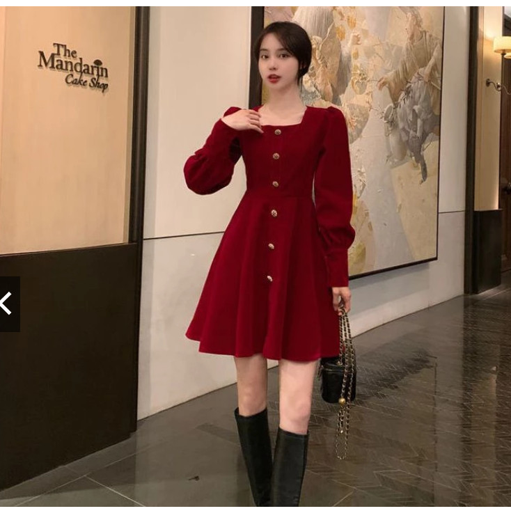 MISS EMITA Baju Fairy Mini Dress Merah Wanita Kekinian Korean Style Princess Dress Pesta Mewah Elegan Lengan Panjang Nat