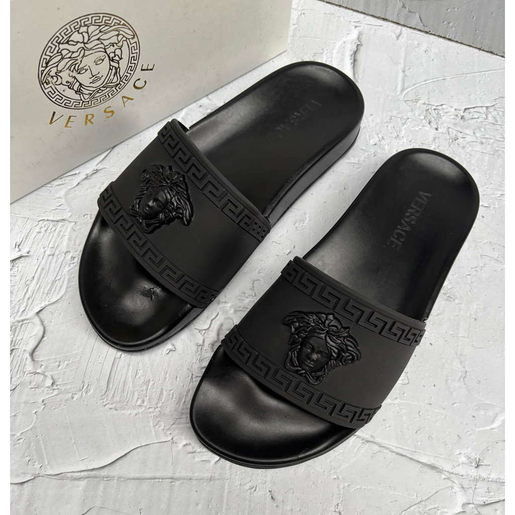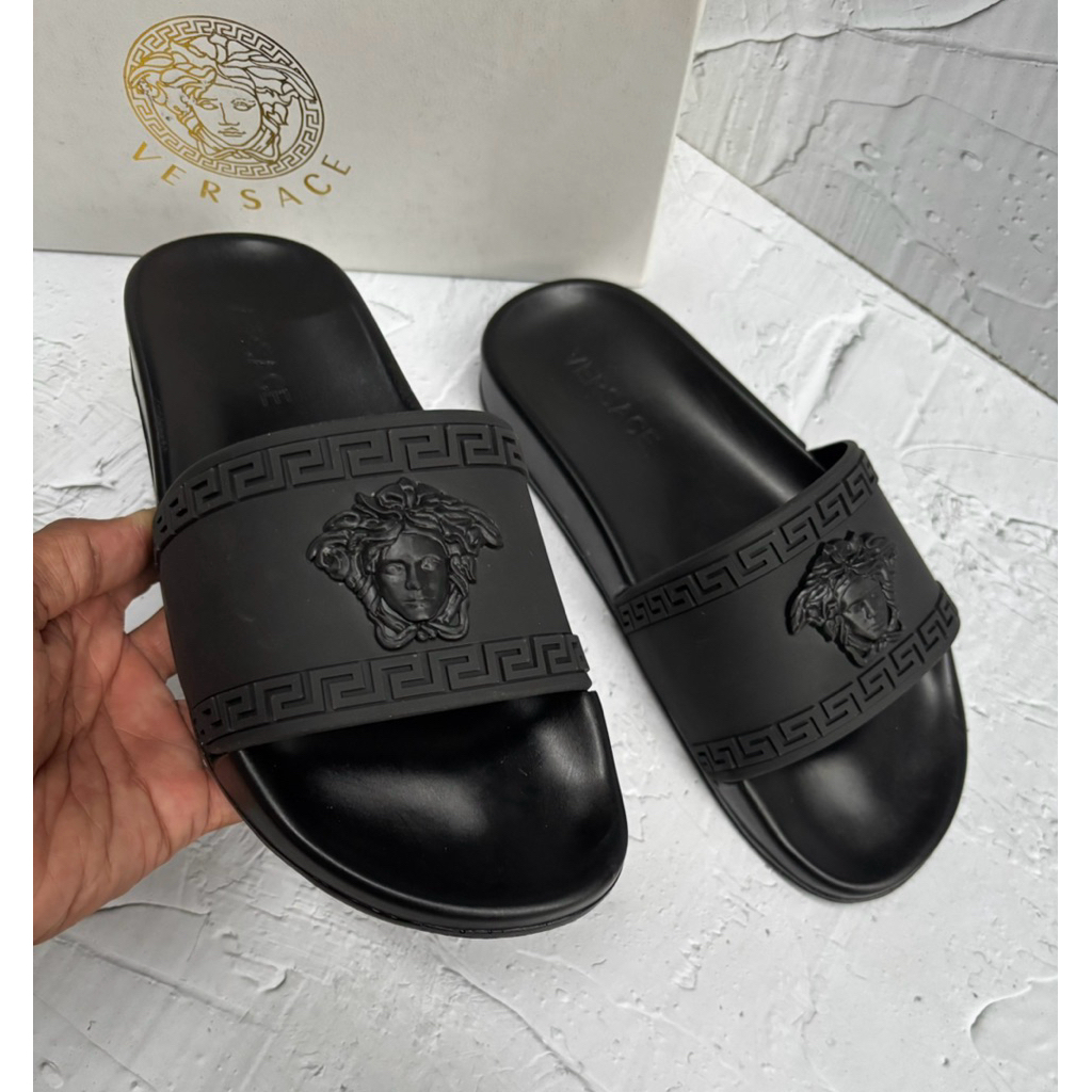 sandal slip on premium miror tpr logo kepala motif garis hitam polos