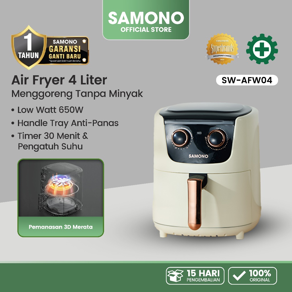SAMONO Air Fryer 4L 650 Low Watt Mesin Penggorengan Tanpa Minyak Touch Screen Magic Fryer Pot 7 Mode Masak SW-AFW04 White