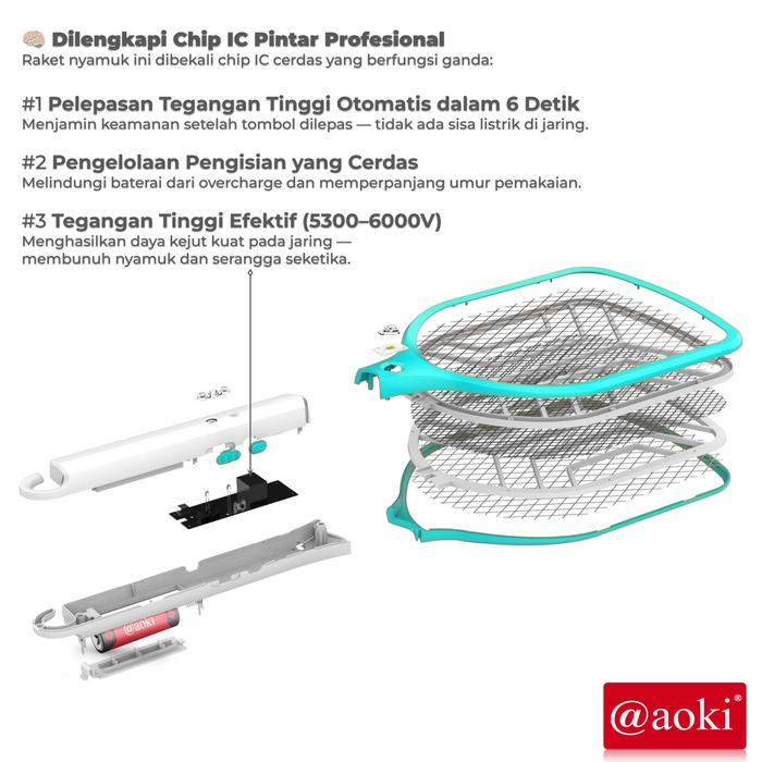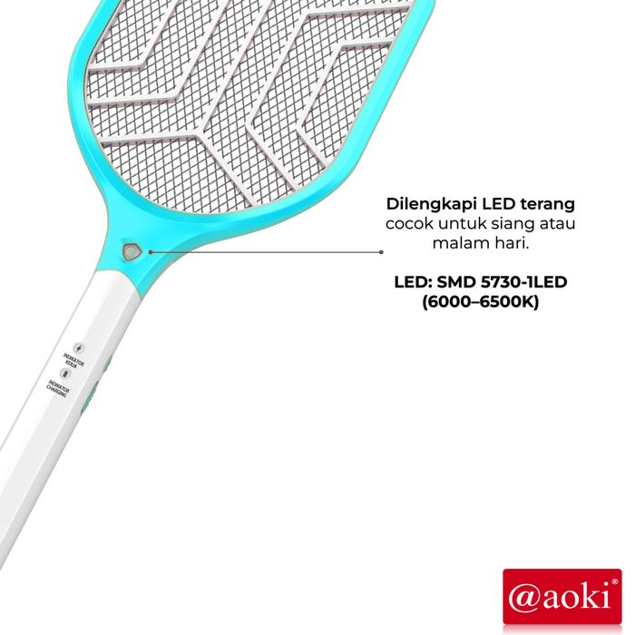 Aoki Raket Nyamuk Rechargeable – Tegangan Tinggi 6000V – Baterai Bisa Diganti – Baterai Lithium 1200Mah - Electric Cyan