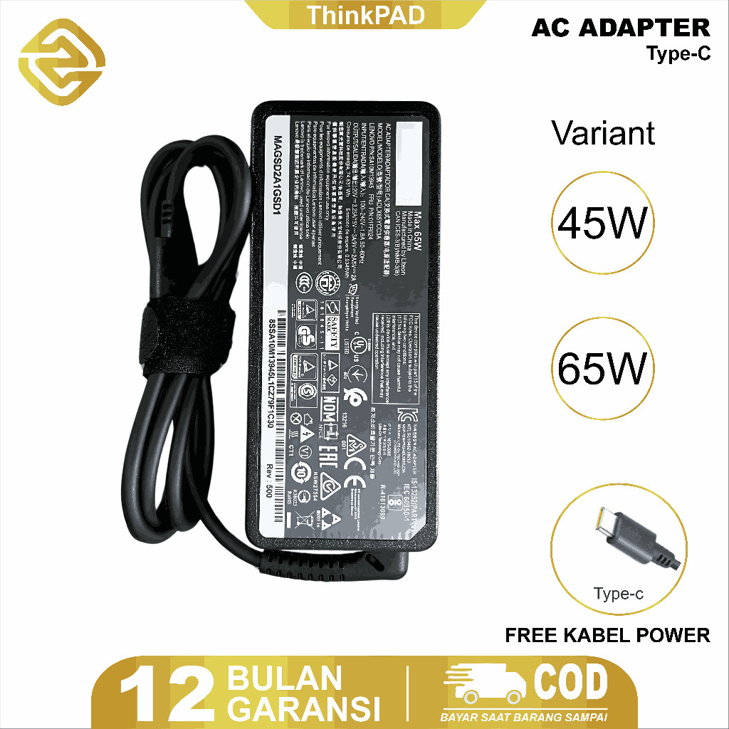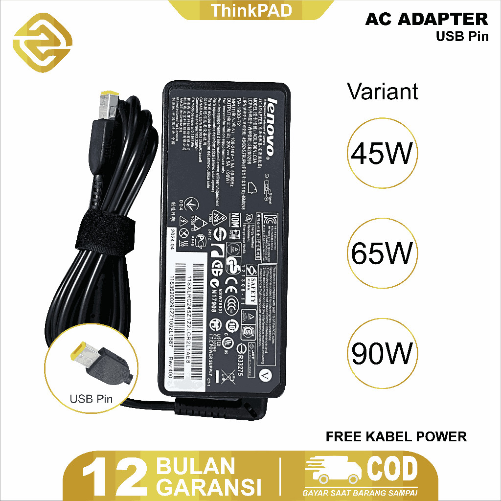 ZPH Adaptor Charger Laptop ThinkPad IdeaPad Yoga Slim 2 Tipe Pin (Konektor USB Kuning / TYPE C) 20V 45W/65W/90W FREE Kabel Power