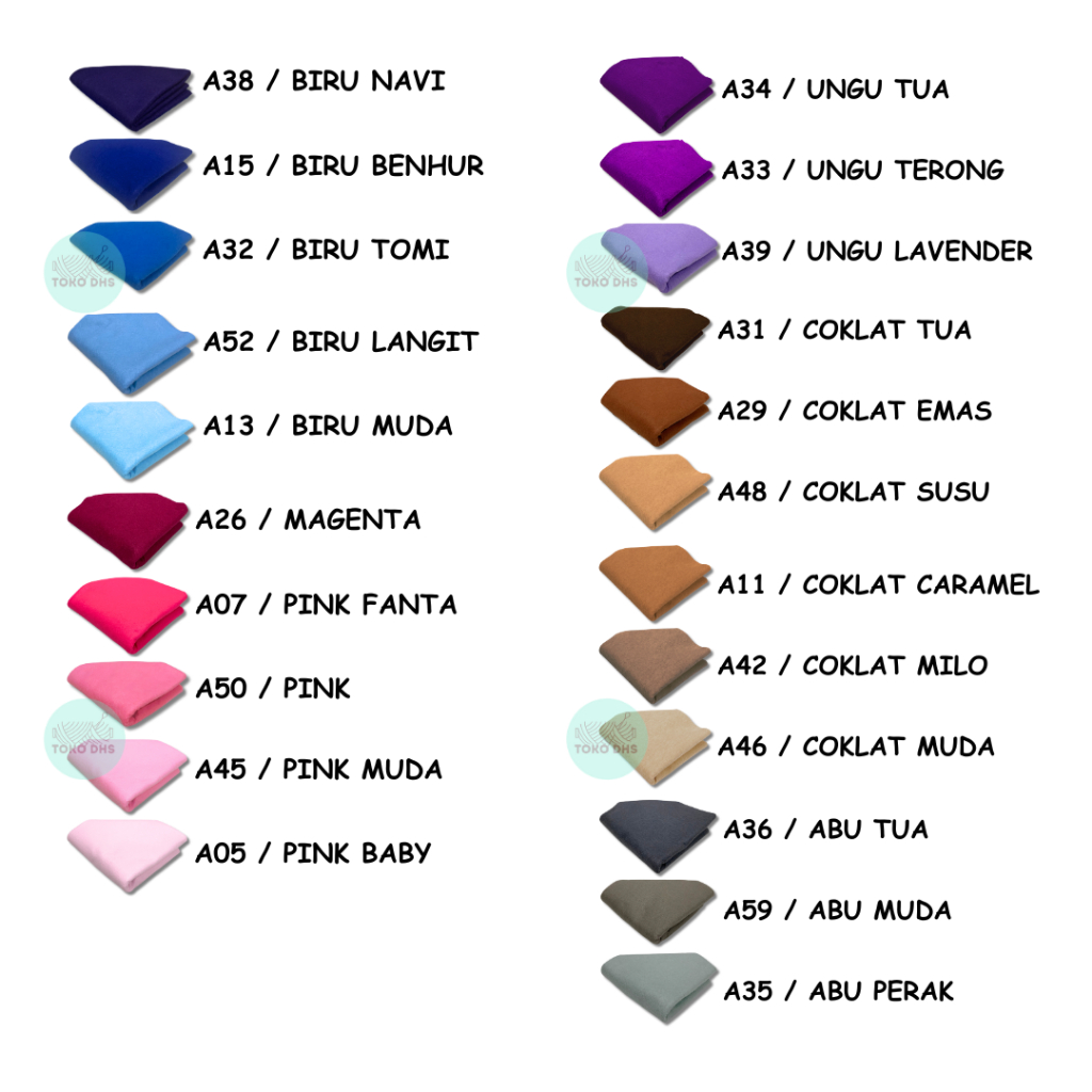 A28 = HITAM, A01 = PUTIH, A49 = BROKEN WHITE, A27 = MAROON, A25 = MERAH, A24 = MERAH CABE, A23 = BATA, A22 = ORANGE STABILO, A21 = SUNKIST, A03 = ORANGE MUDA