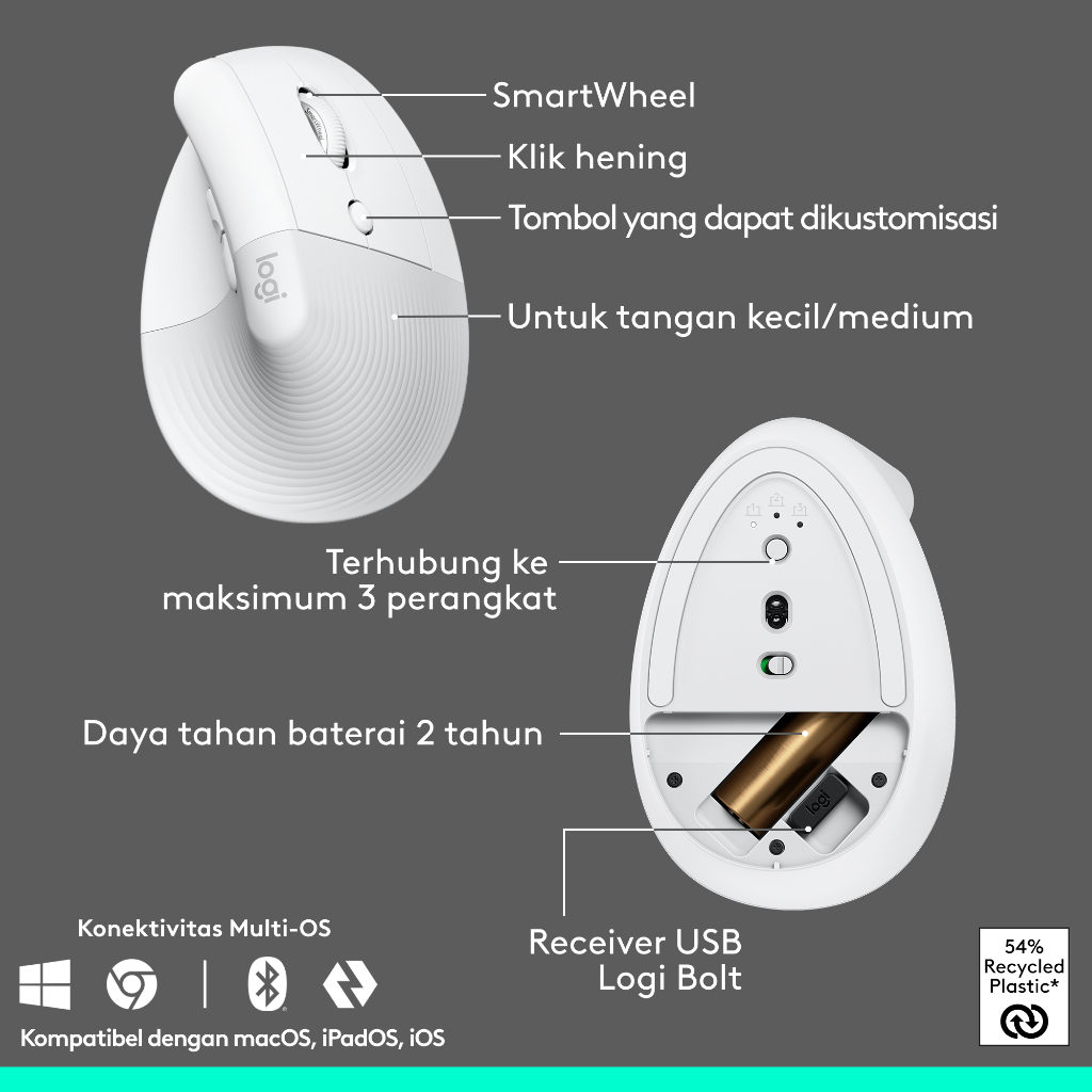 Logitech COMBO Wave Keys & Mouse Vertikal Lift Logitech - Keyboard dan Mouse Nirkabel Ergonomis - dengan Penyangga Telapak Tangan Empuk, Easy-Switch, Bluetooth, untuk Multi-OS, Windows/Mac
