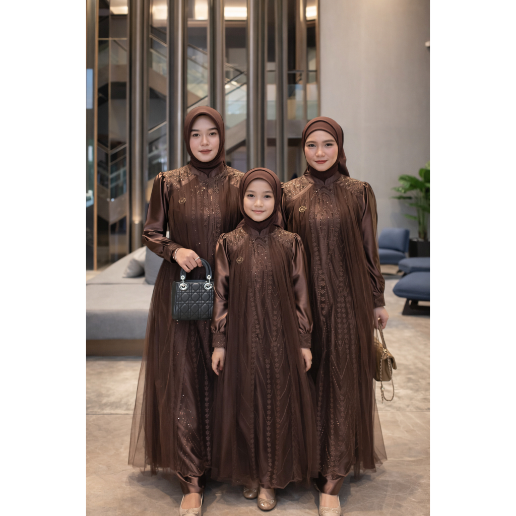 Gamis Brokat Couple Ibu & Anak Mewah Terbaru Dress Pesta Brokat Mahogany Gamis Sarimbit Lebaran 2026