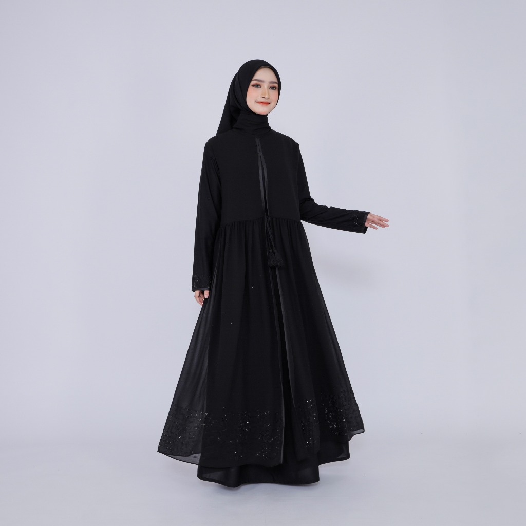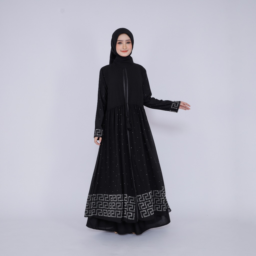 Abaya Turki Hitam Putih Couple Ibu dan Anak Perempuan Baju Gamis Turkey Remaja Tanggung Bahan Jersey mix Ceruty dengan Mote Silver, Dan Gold Mewah