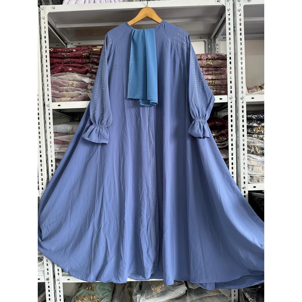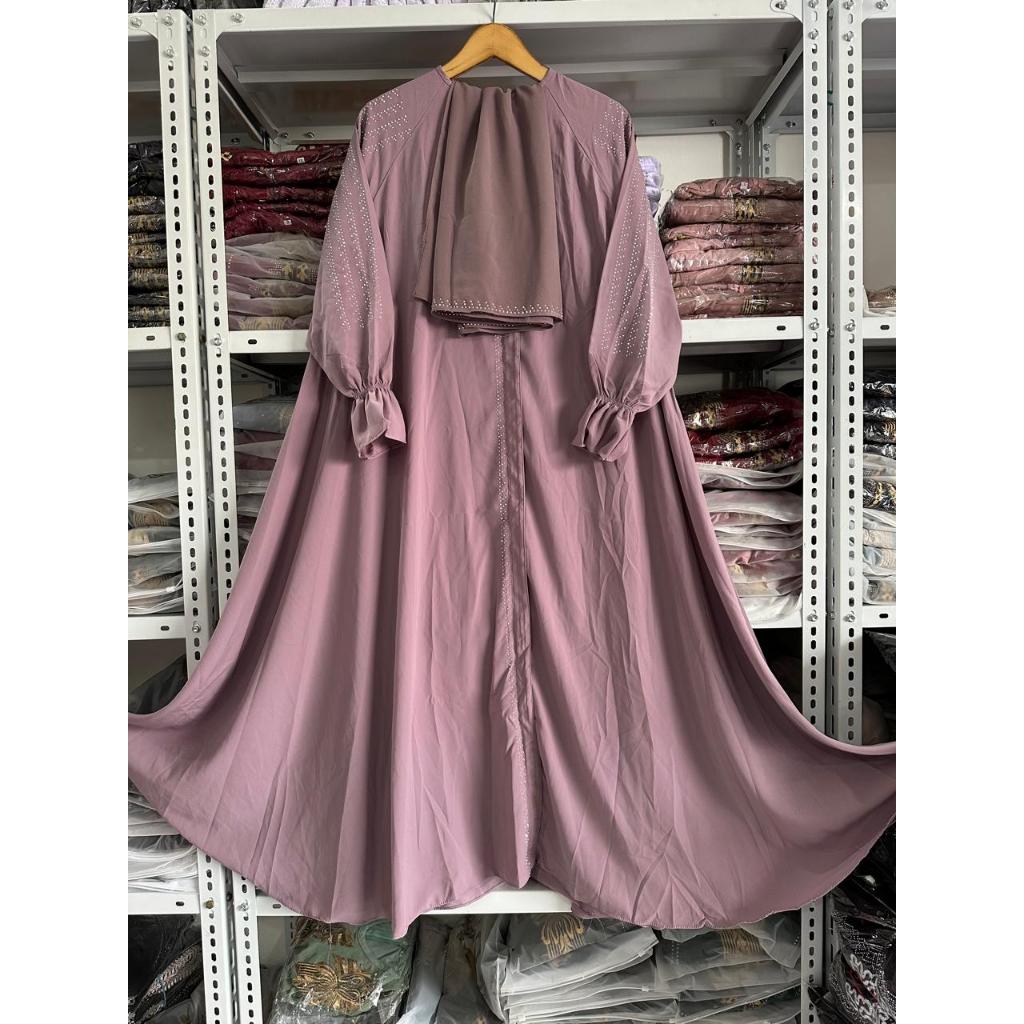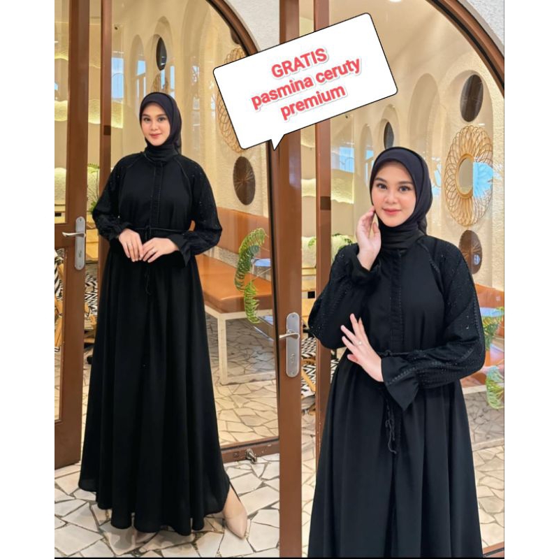 Abaya premium set kerudung pasmina resleting full bisa jadi outer jetblack wolpich dubai terbaru