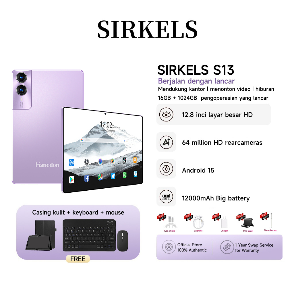 SIRKELS Tablet S13 12.8''IPS Screen 16GB+1024GB ROM | 12000mAh | Android 15 | 5G Dual SIM Wifi | Layar besar 12.8inch | belajar kantor bermain game [Sirkels Official Store]