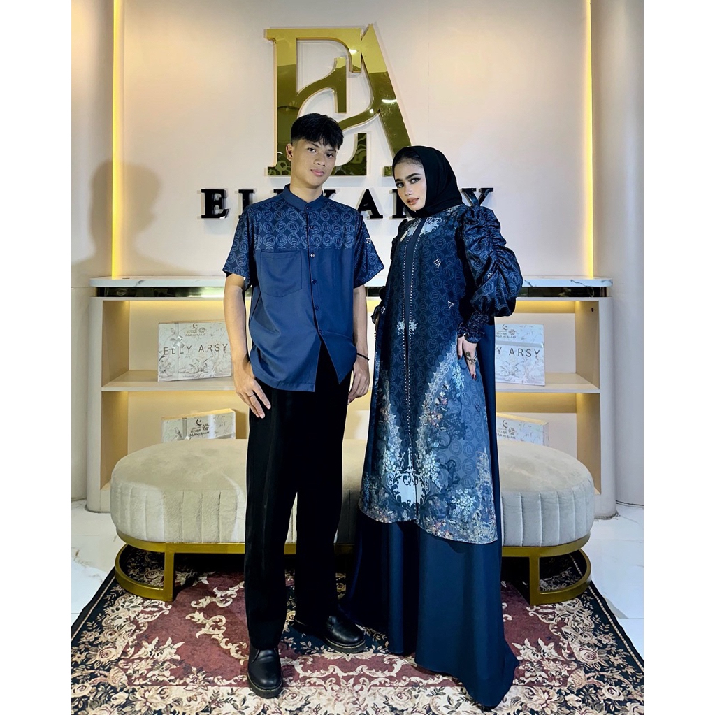 Jemiaa Sarimbit Raya Series Gamis Satu Set Couple Navy Material Lady Zr Ceruty Tuan Putri Aksen Mutiara Patten Exlusive By Elly Arsy (Tanpa Hijab )