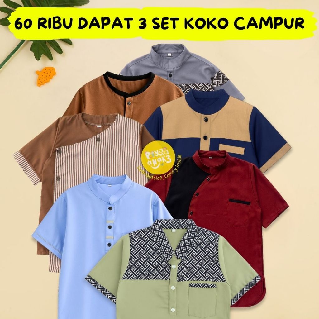PAKET 3 SETELAN KOKO CAMPUR KURTA ANAK BATIK DADA KANCING LIS GARIS 1-10 TAHUN 60RIBU DAPAT 3 SET