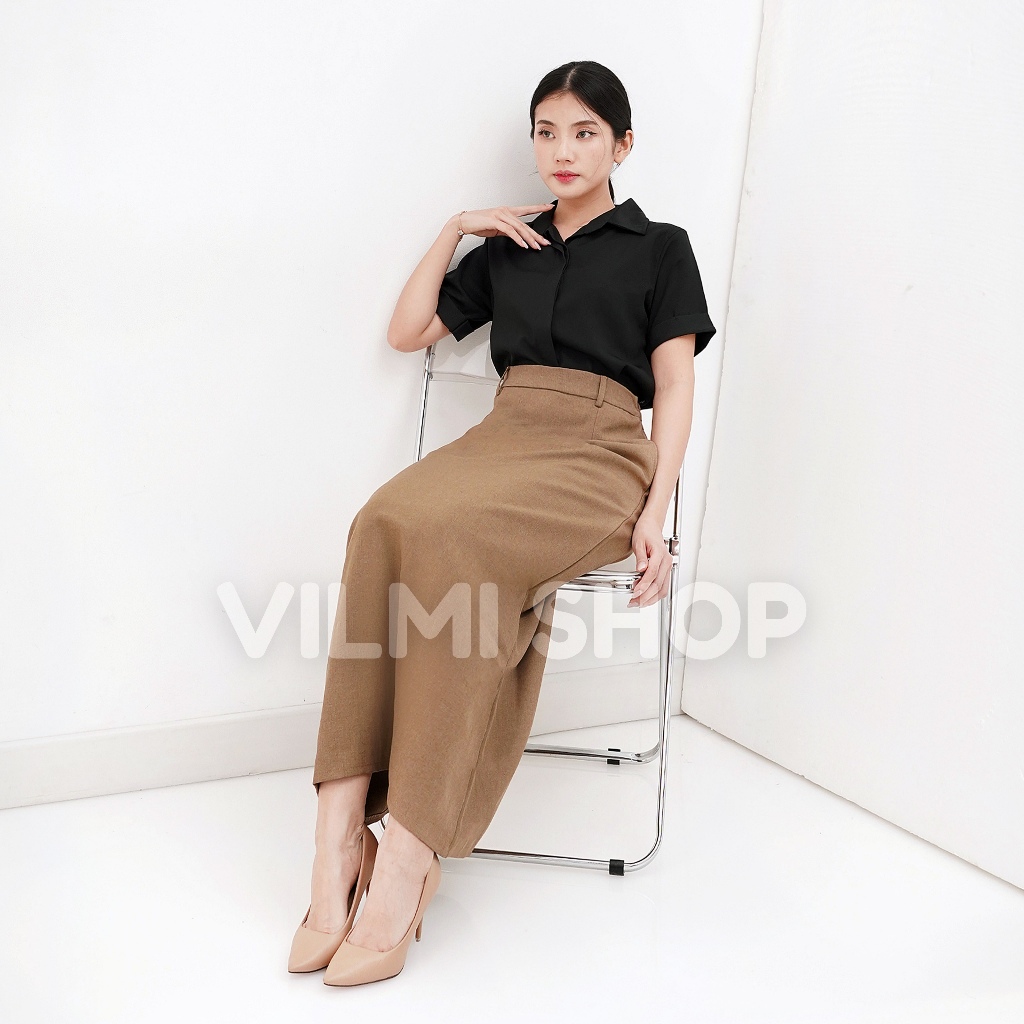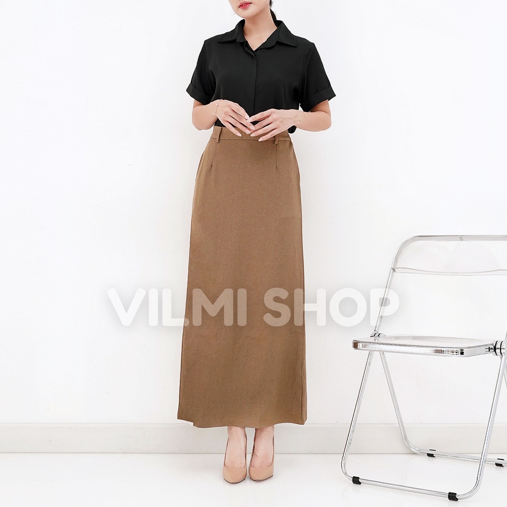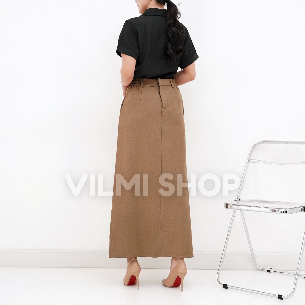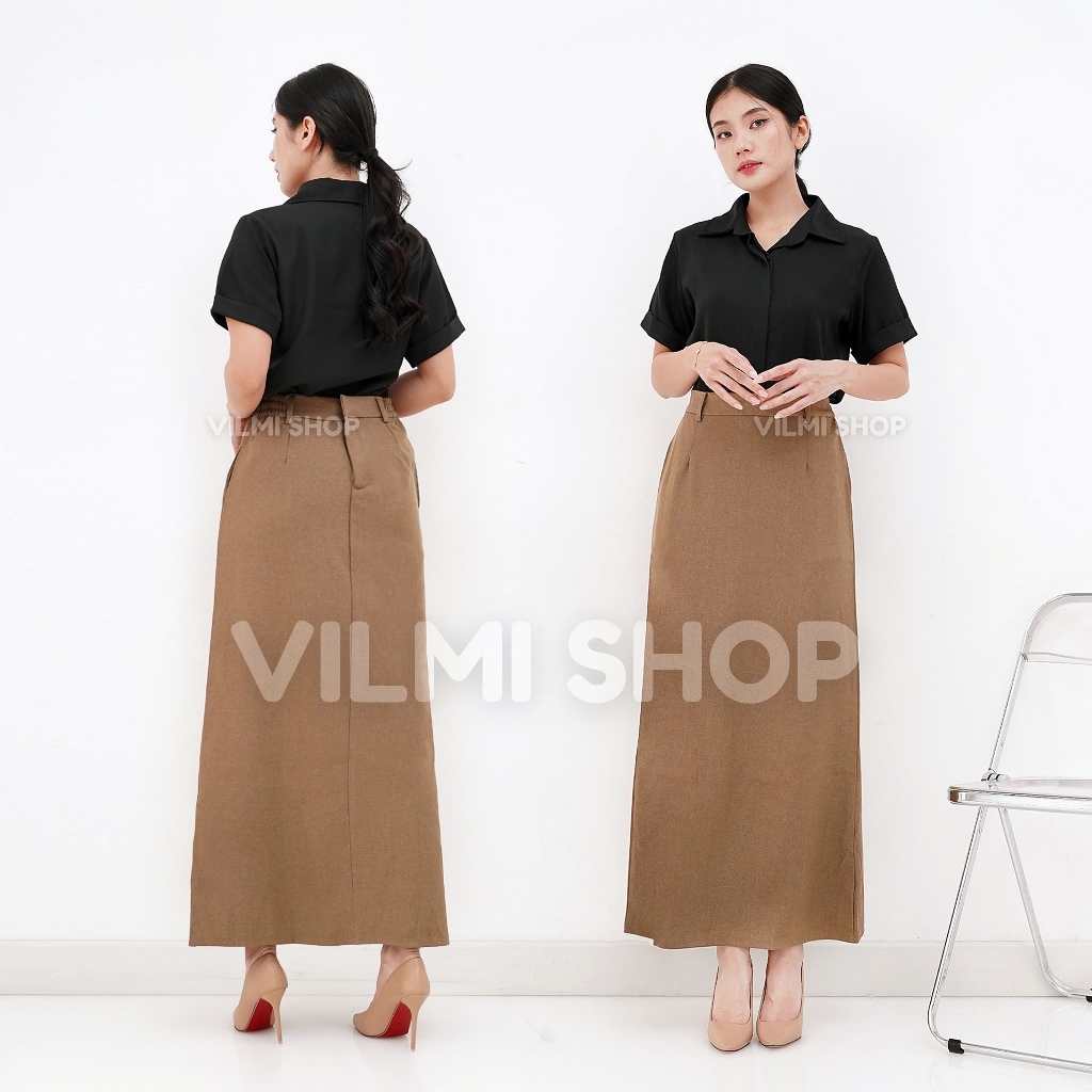 Rok Kerja Model A Line Wanita Formal Pinggang Karet Samping Resleting Bahan Stretch Premium